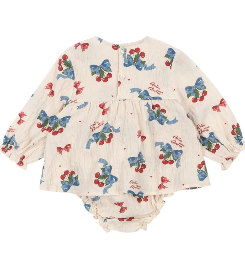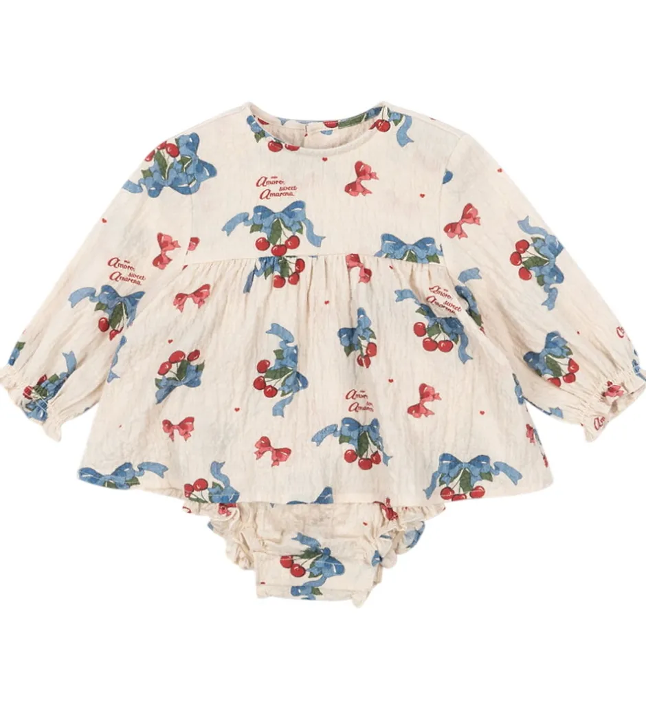 Delikat Konges Sløjd sommerdragt i en lysebeige nuance med et charmerende print af kirsebær og blå sløjfer i blå og røde nuancer.