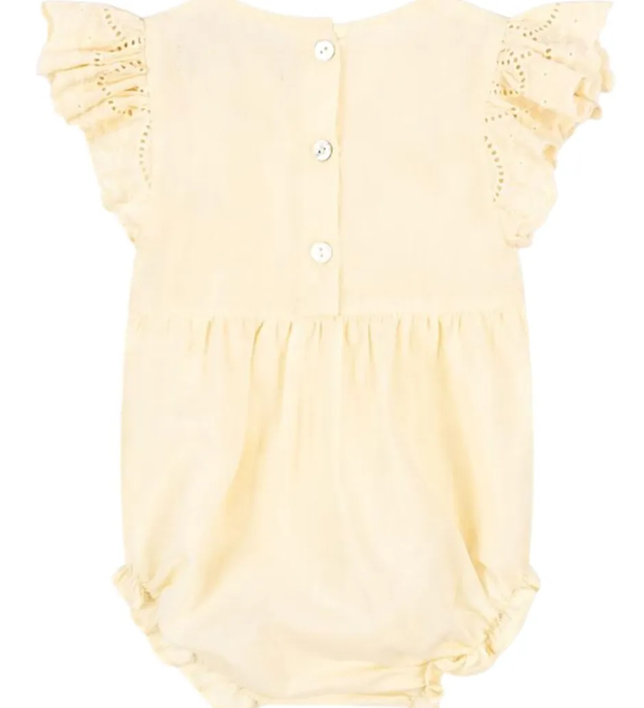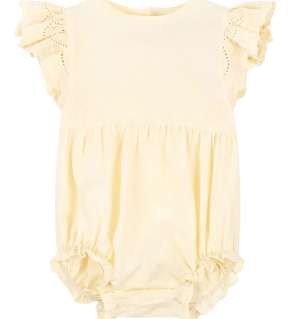 Sommerdragten har fine, korte flæseærmer med broderede detaljer, der skaber et elegant udtryk. Modellen har en rummelig pasform med elastikbånd ved benene og praktiske trykknapper i mellem benene for nem påklædning.