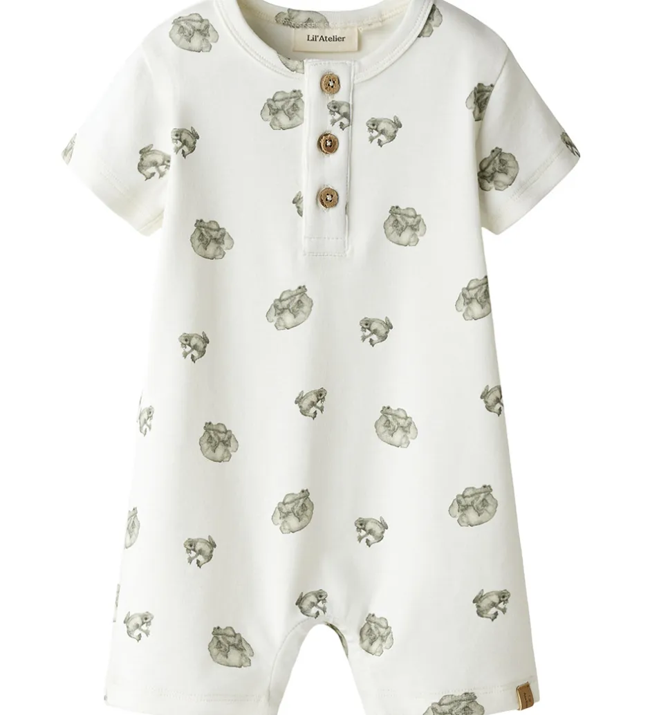 Sød Lil Atelier sommerdragt i råhvid med print af grønne frøer. Sommerdragten har en rund halsudskæring med træknapper fortil og korte ærmer. Den har korte ben og lukkes mellem benene med trykknapper.
