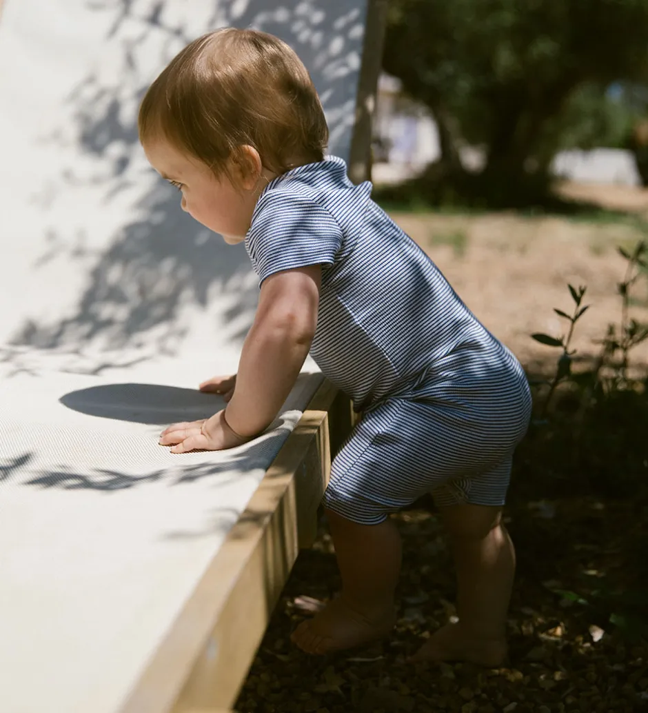 Sommerdragten har korte ørmer og korte ben. Dragten har praktiske foldeskuldre, mens den mellem benene kan åbnes helt af trykknapper. Designet sikrer komfort og bevægelsesfrihed for de små, mens den stilfulde farvekombination tilføjer et friskt udtryk.
