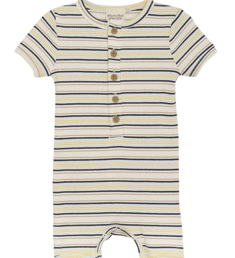 Minymo sommerdragten har korte ærmer og ben og åbnes ved stolpelukningen fortil med fine knapper i trælook og med almindelige trykknapper mellem benene. Der er smalle ribkanter ved alle åbninger og sommerdragten er fremstillet i en blød og strækbar kvalitet.