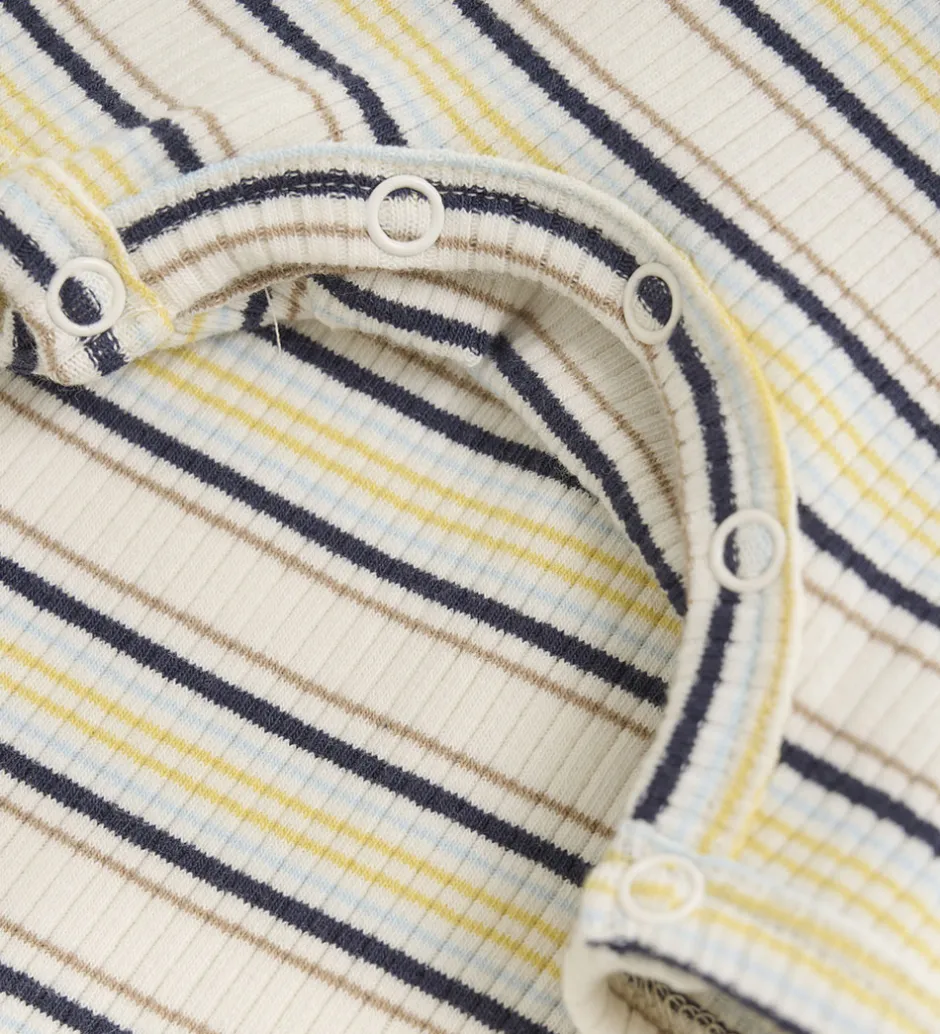 Skøn Minymo sommerdragt i beige rib og med smalle striber i brun, gul og blå.