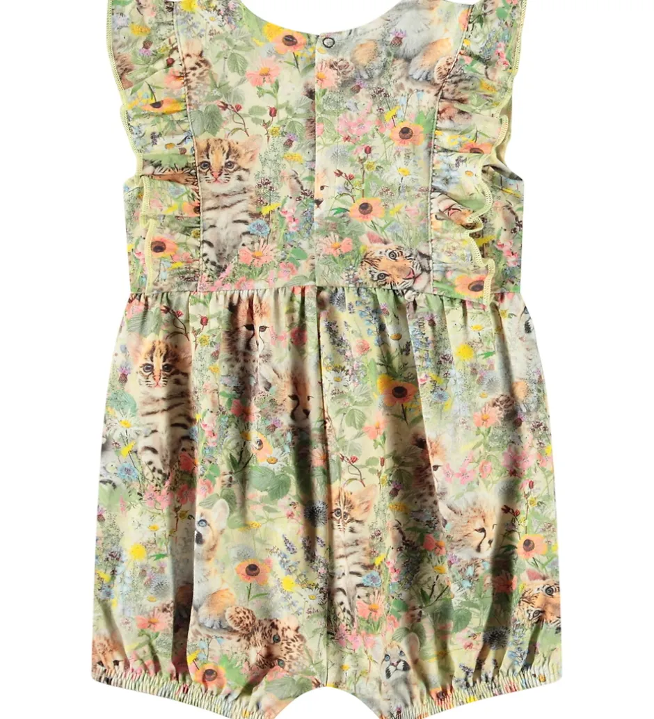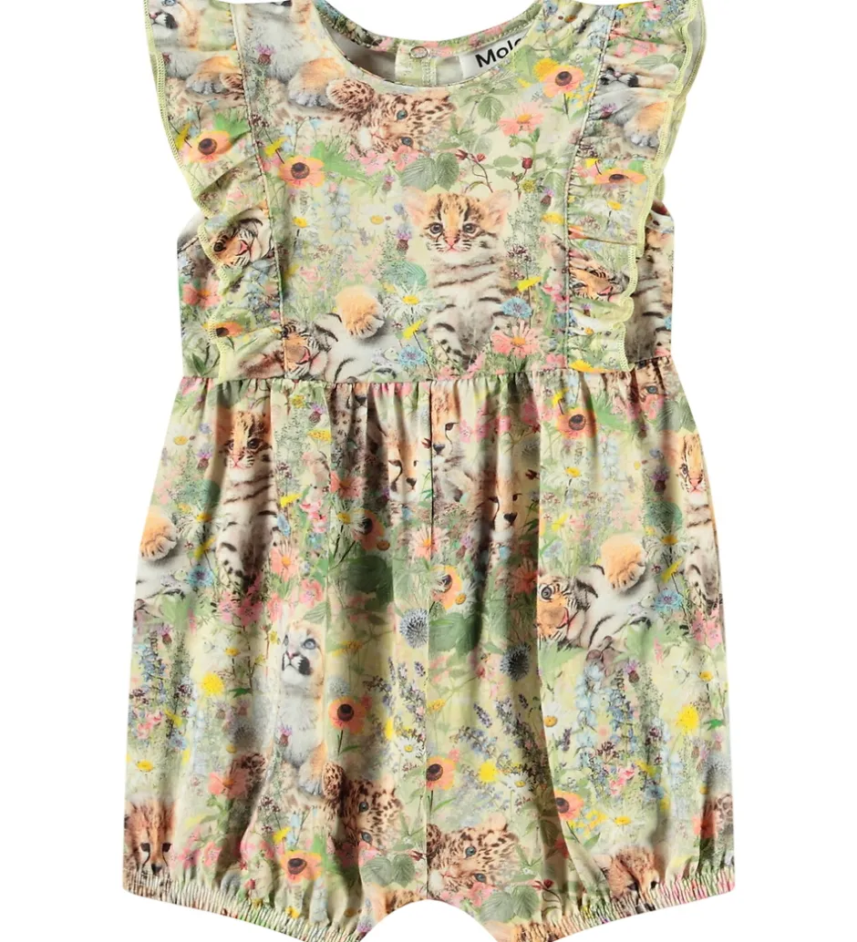 Farverig Molo sommerdragt i grøn med et charmerende print af søde små leopardunger og tigerunger, omgivet af blomster. Sommerdragten har korte ærmer med med fine flæser over skuldrene og ned ad fronten og ryggen. Buksebenene er helt korte, og de har smalle elastikkanter. Molo sommerdragten er udført i bløde materialer og har praktiske trykknapper mellem benene og i nakken.