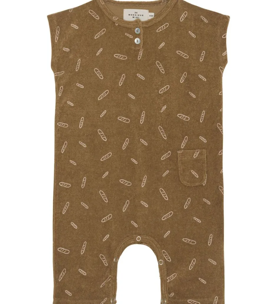 Sød Monsieur Mini sommerdragt i brunt frotté med et allover print af baguettes.