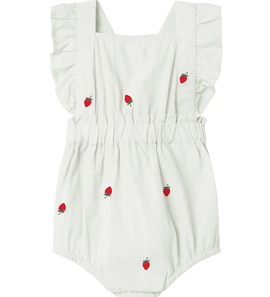 Praktisk Name It sommerdragt i en hvid farve med søde broderede jordbær på hele designet. Sommerdragten har smukke flæser ved skuldrene, hvilket giver et fint og legende look.
