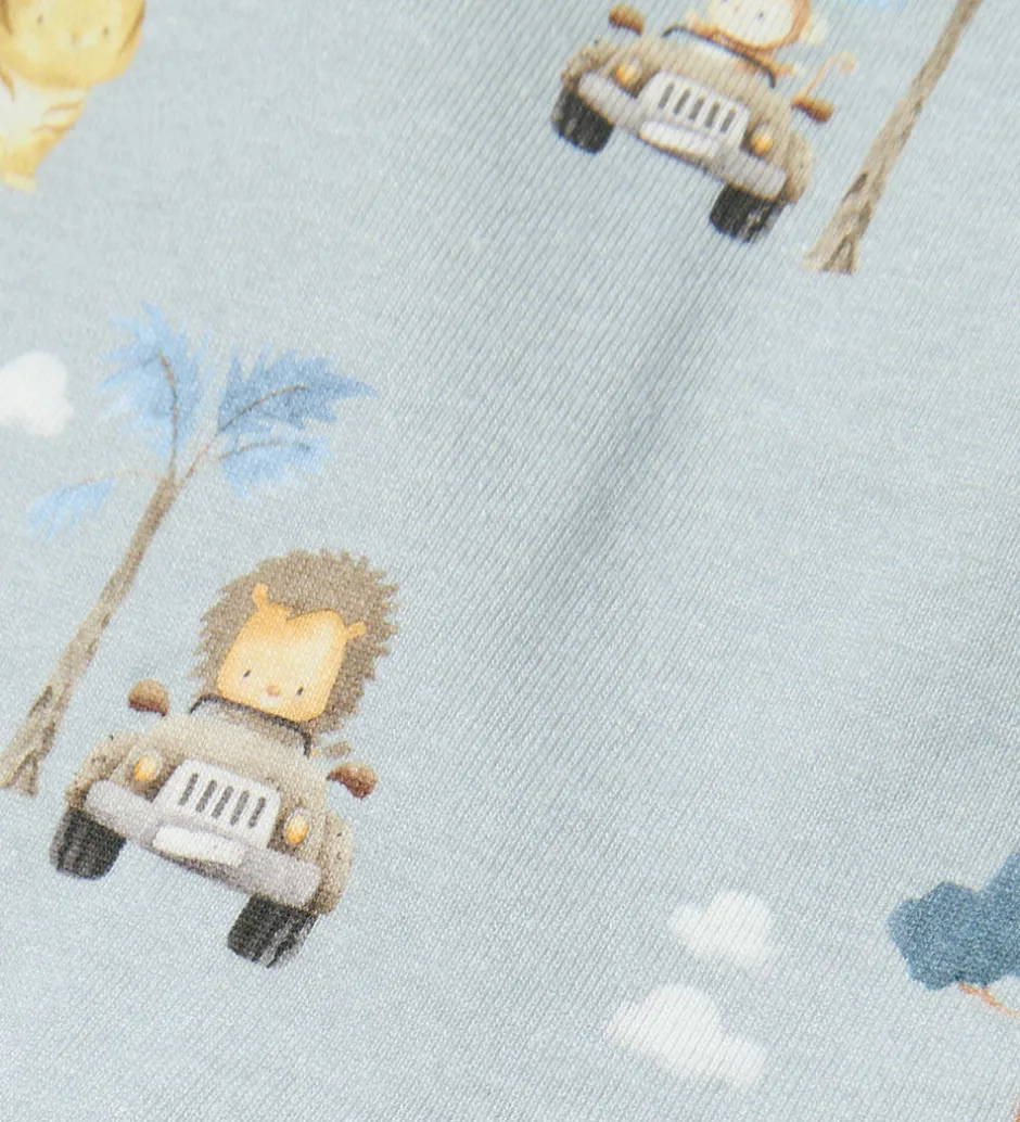 Dejlig Name It sommerdragt med korte ærmer i lyseblå med et finurligt print af dyr, telte og palmer. Sommerdragten fra Name It har praktiske knapper på fronten for nem påklædning.