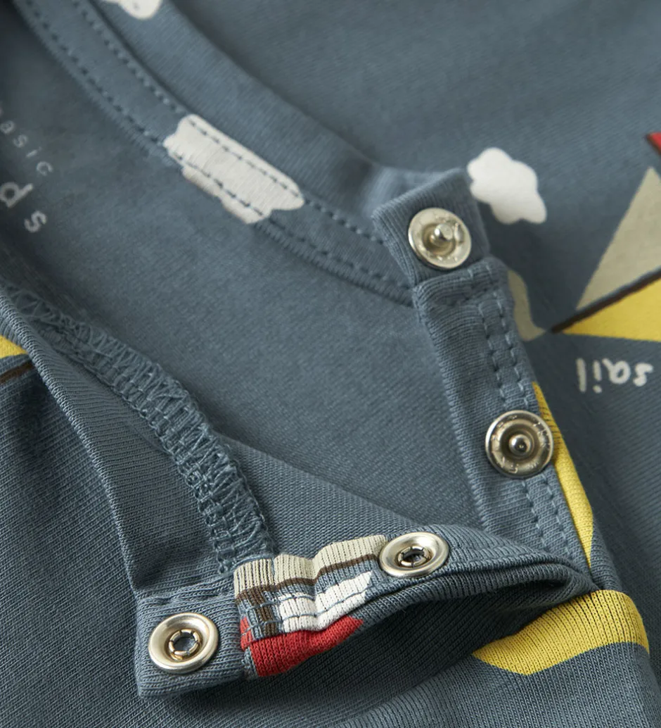 Charmerende Name It sommerdragt i en støvet blå. Sommerdragten har et sødt print med små sejlbåde i forskellige farver, hvilket giver et legende udtryk.