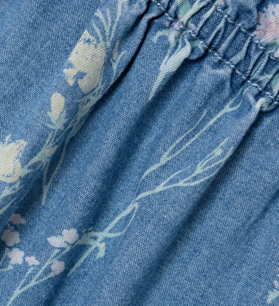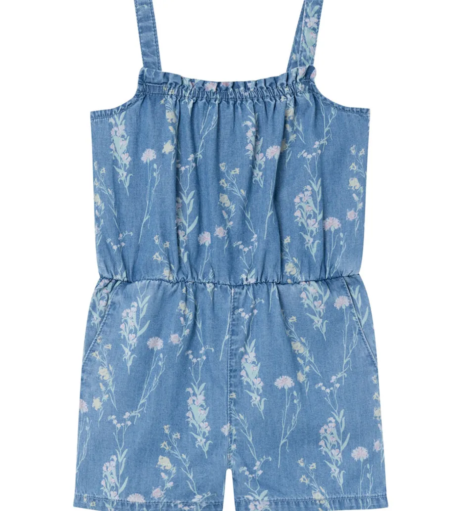 Skøn Name It sommerdragt i medium blue denim med et fint all-over print af blomster i lyse nuancer.