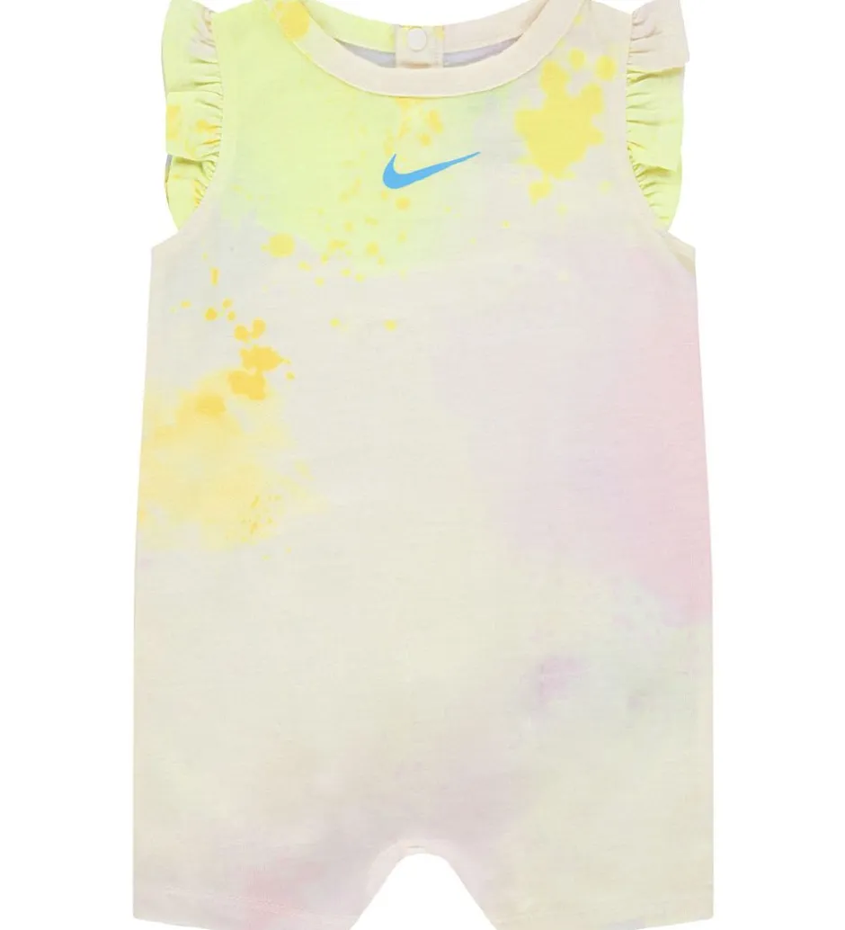 Sød Nike sommerdragt med et allover mønster af pletter i gule, lavendel og rosa nuancer. På brystet er der et blåt logoprint.