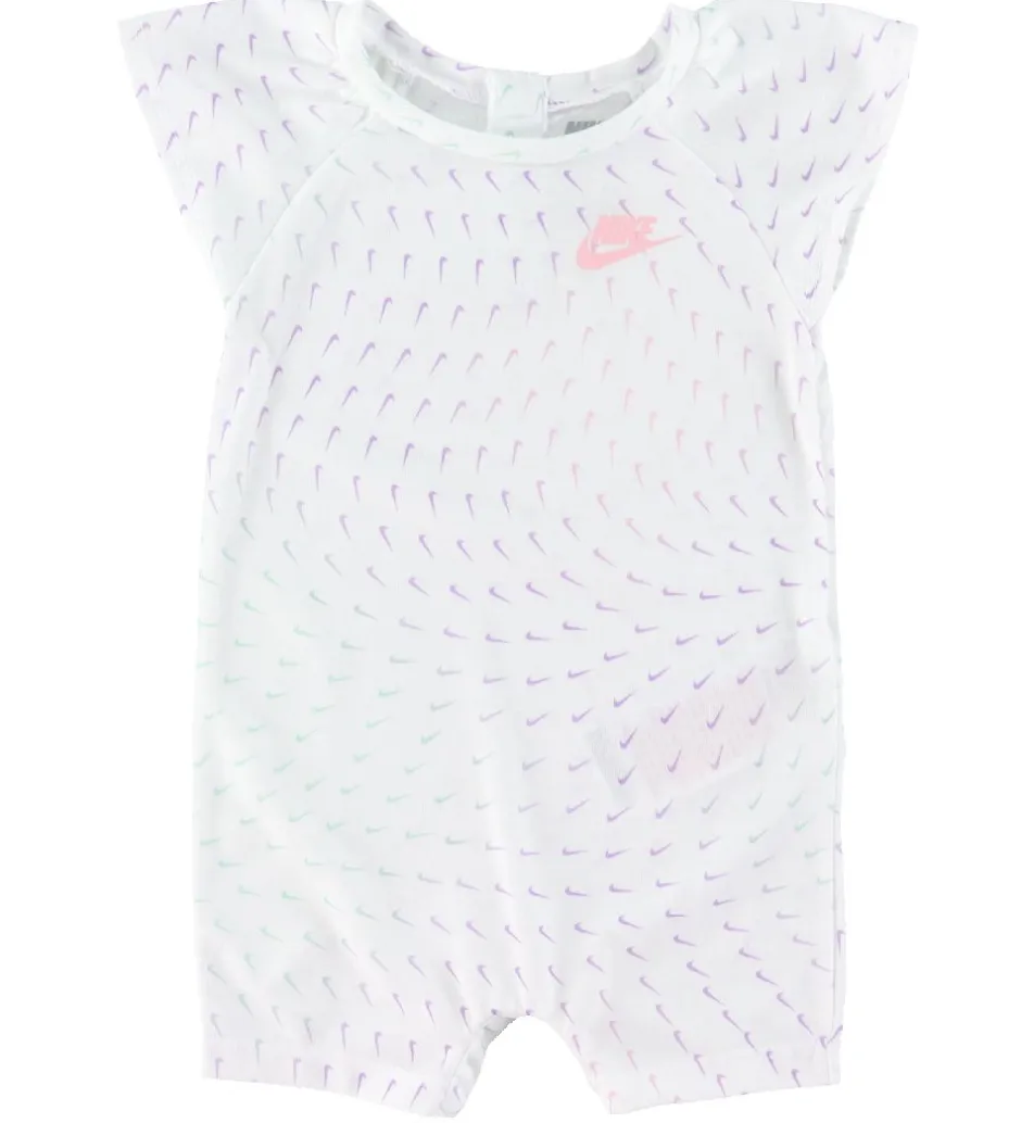 Skøn Nike sommerdragt i hvid med et alloverprint af små Nike logoer i lilla, rosa og mint. På venstre bryst er der et rosa logoprint.