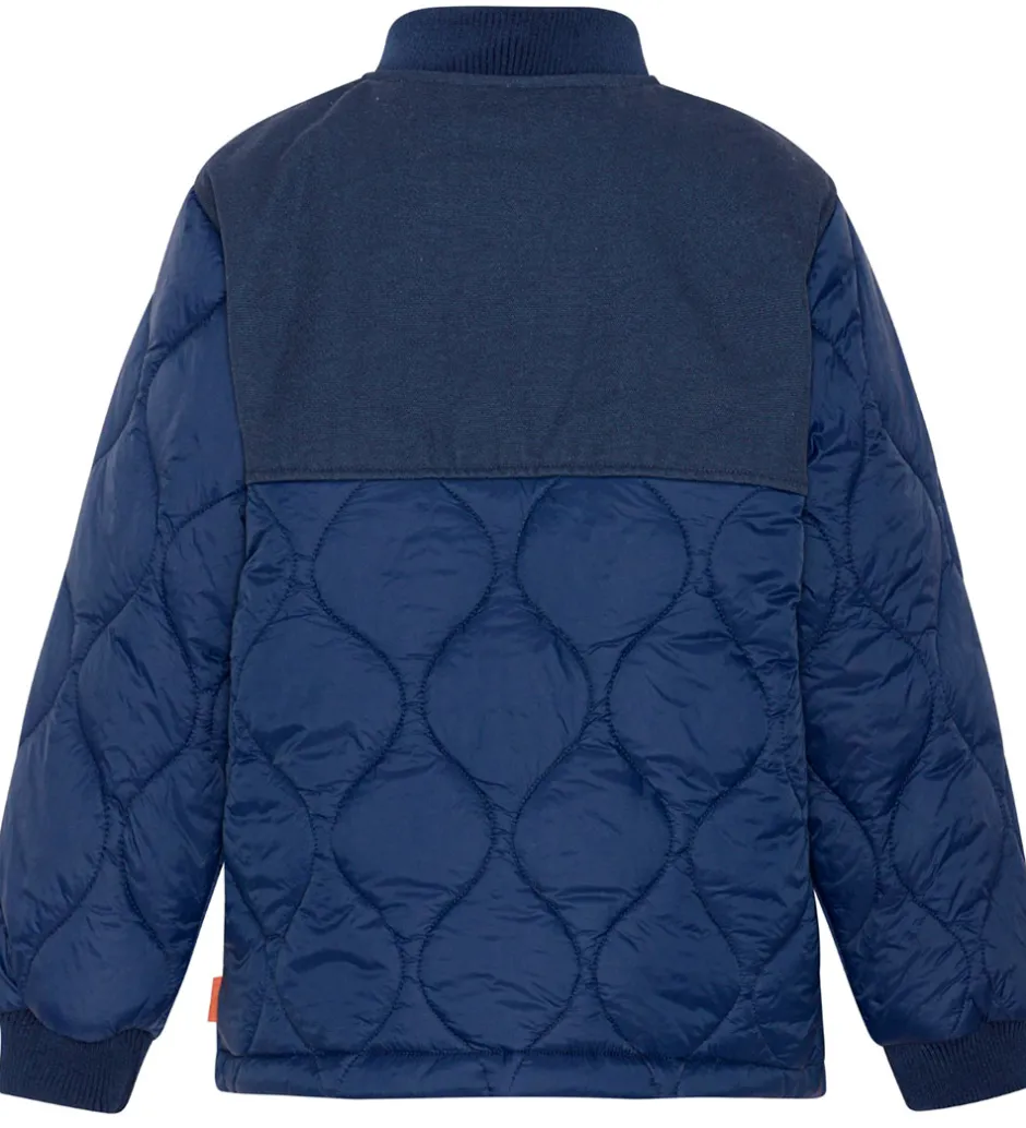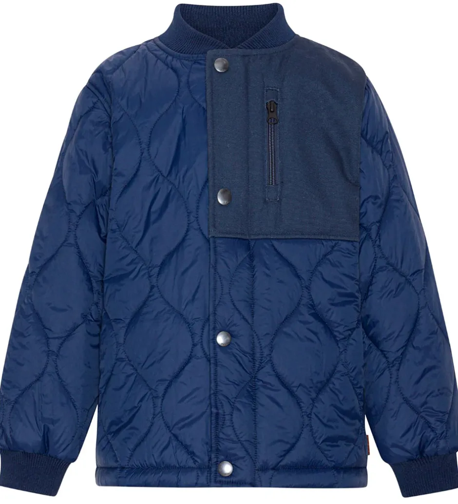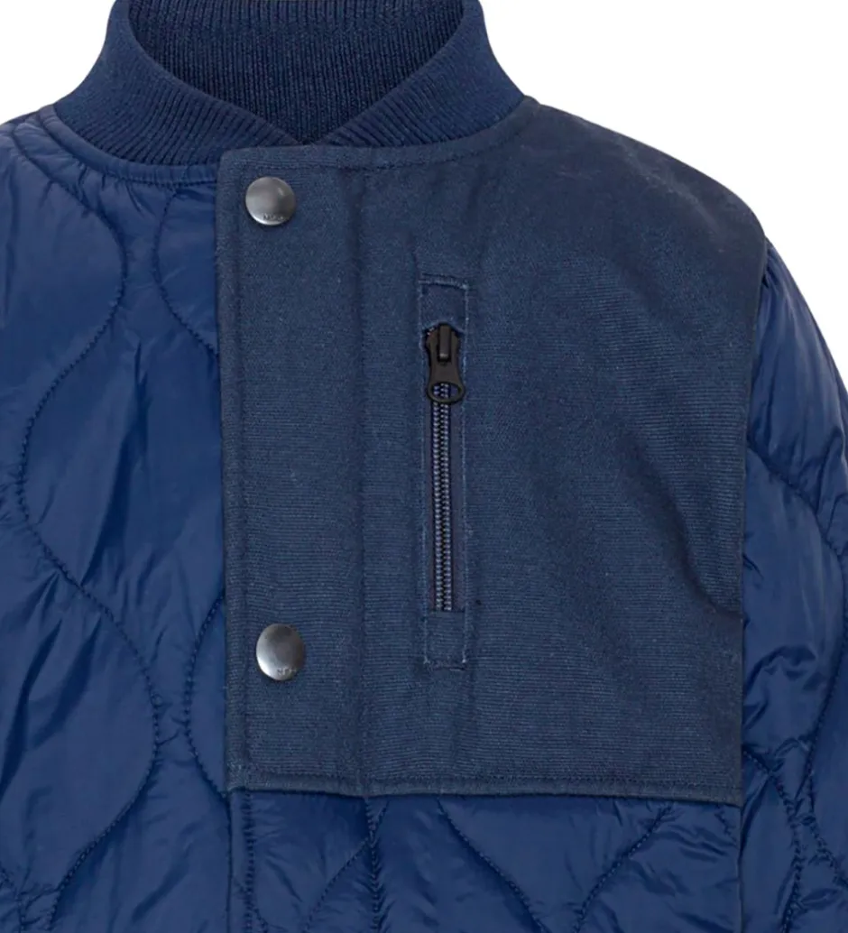 Sej Molo sommerjakke i navy, med en quiltet struktur. Fortil er der en mørkeblå del i venstre side af halsen som fortsætter bagpå i toppen. Indenvendigt er jakken i en fin støvet grøn.