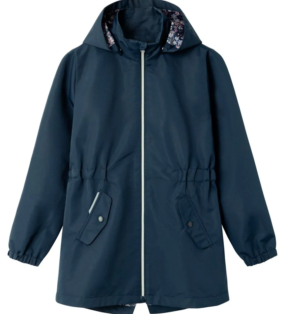 Name It sommerjakken har en aftagelig hætte, som fæstnes med trykknapper og velcro langs den høje halskrave. I ærmeåbningerne er der praktiske elastikkanter. I livet er der en bred elastikkant, så den får en mere figursyet pasform.