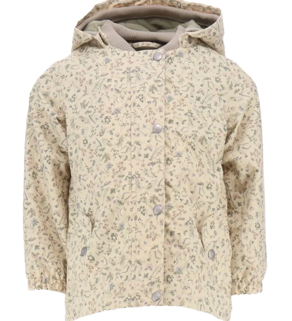 Wheat sommerjakken har en aftagelig hætte, som sidder fast med sølvfarvede trykknapper. I toppen kan den justeres med velcro, og i ansigtsåbningen har den en bred ribkant. Ærmerne har elastikkanter, og i halsåbningen har den en blød ribkant. I livet kan den strammes ind med en elastiksnøre på indersiden.