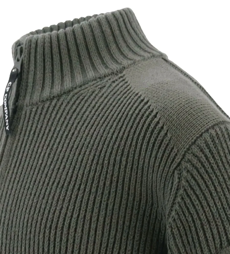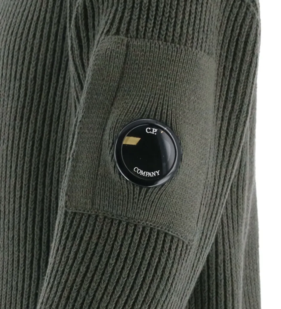 Smart C.P. Company cardigan i ensfarvet armygrøn i en strikket kvalitet med en flot ribstruktur. Øverst på venstre ærme sidder der et sort plastiklogo.