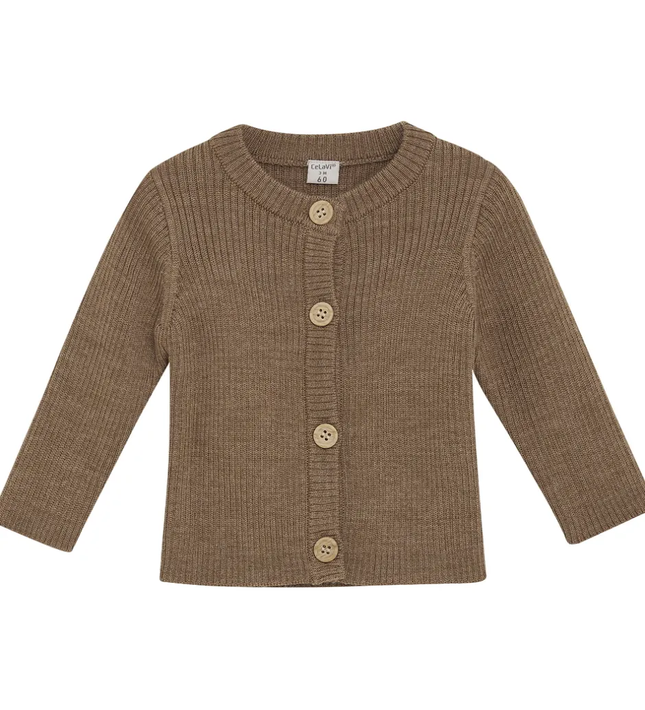 Flot CeLaVi cardigan i ensfarvet brun, og den er lavet af blødt og lækker merinould med ribstruktur.