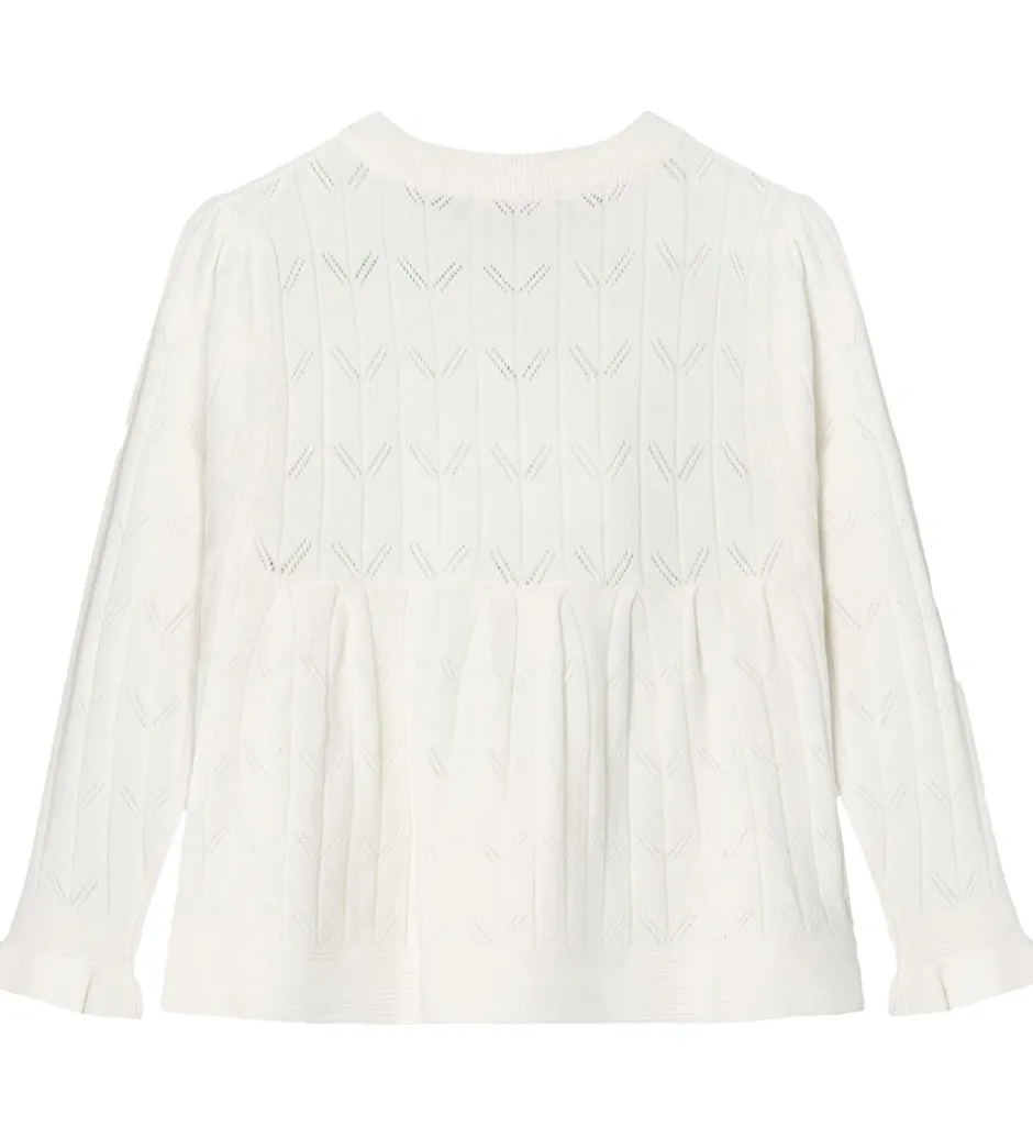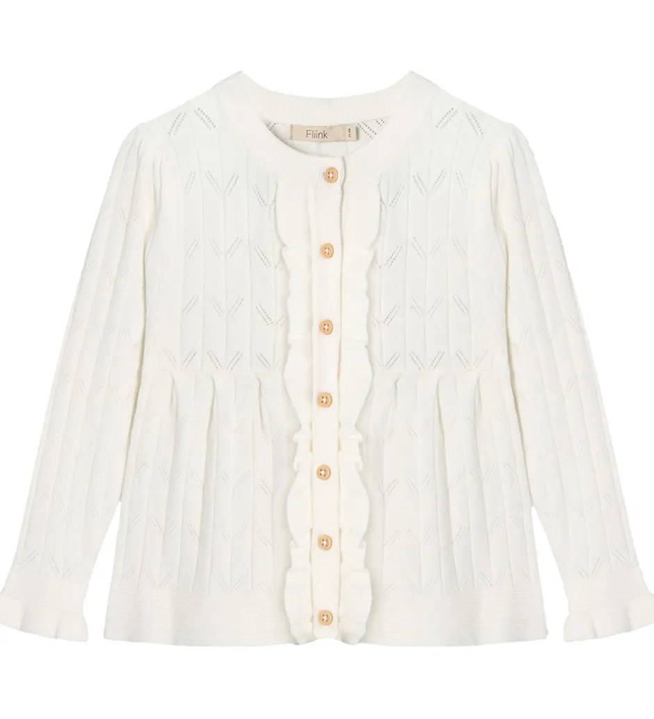 Charmende Fliink cardigan i hvid med fine detaljer. Fliink cardiganen har lange ærmer og flotte knapper ned langs fronten, der giver et klassisk udtryk. Perfekt til garderoben med sit elegante design.