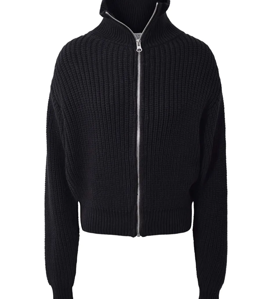 Flot Hound cardigan i sort med en skøn, ribbet strikstruktur. Cardiganen har lange ærmer og en praktisk lynlås foran. Hound cardiganen er designet med en bred ribkant i alle åbningerne, hvilket giver en behagelig pasform. Den høje krave tilføjer et smart element til cardiganens stil.
