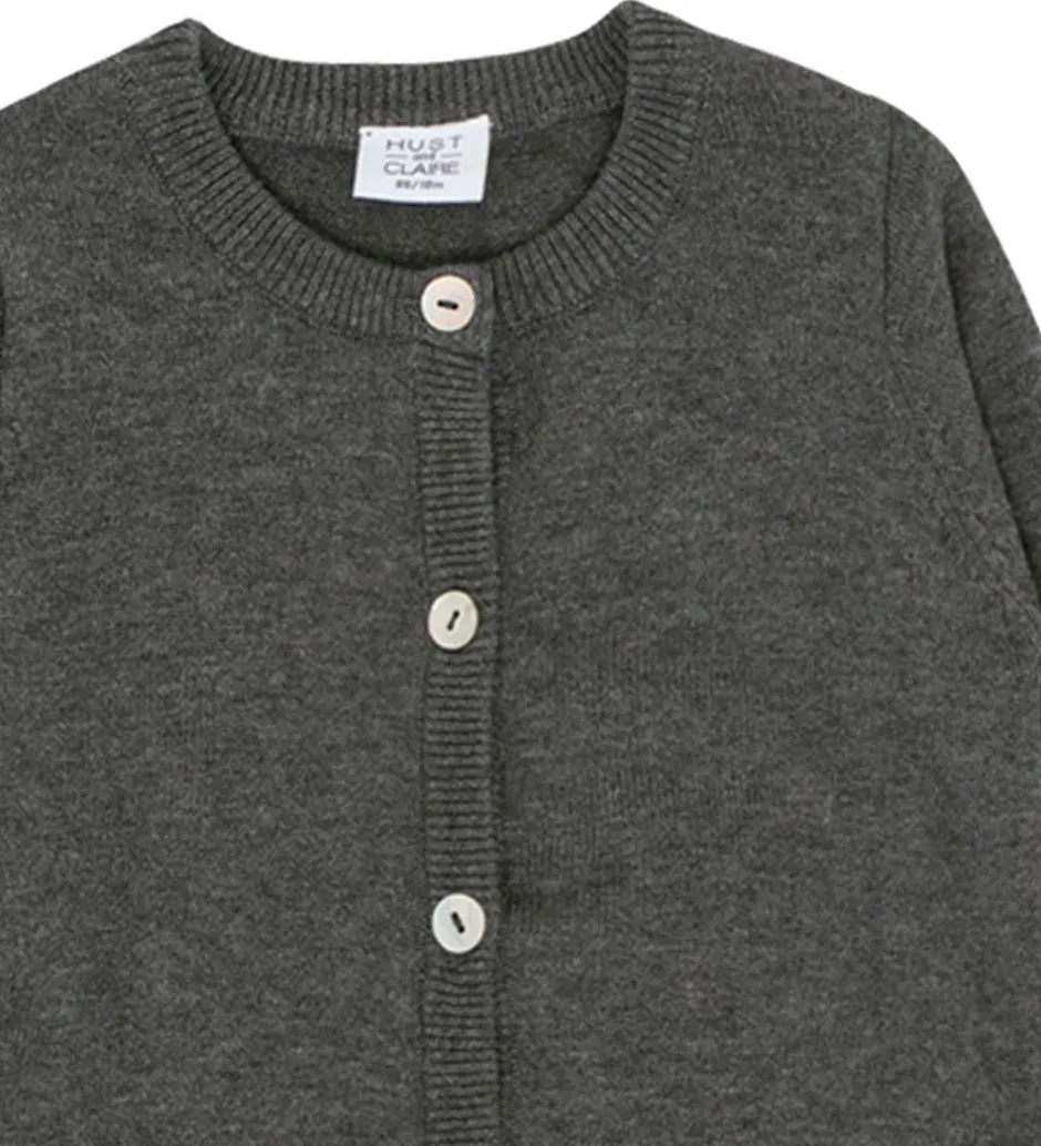 Hust and Claire cardiganen har lange ærmer og kan åbnes fortil, med gennemgående knapper. I alle åbinger er der smalle ribkanter, og cardiganen er i en lækker og behagelig bomuldskvalitet.