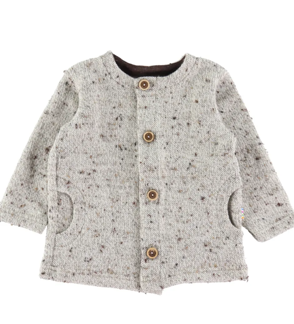 Smart Joha cardigan i en lys grålig beige nuance med små brune nister, i mørkere nuancer.