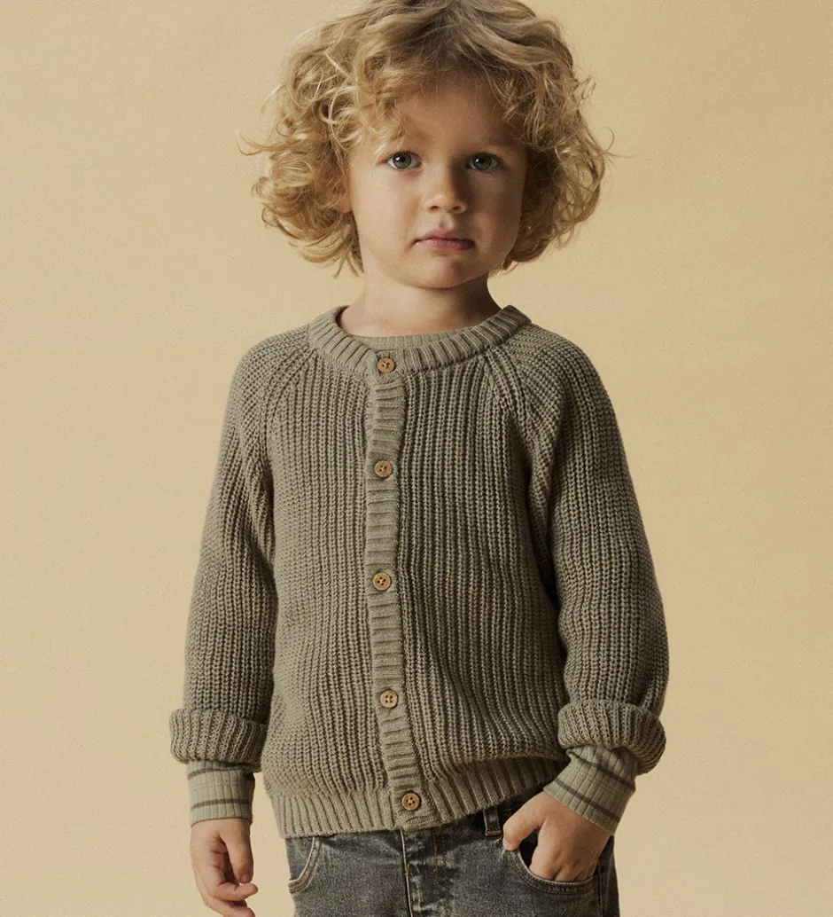 Stilfuld Lil’ Atelier cardigan i en støvet grøn strik.