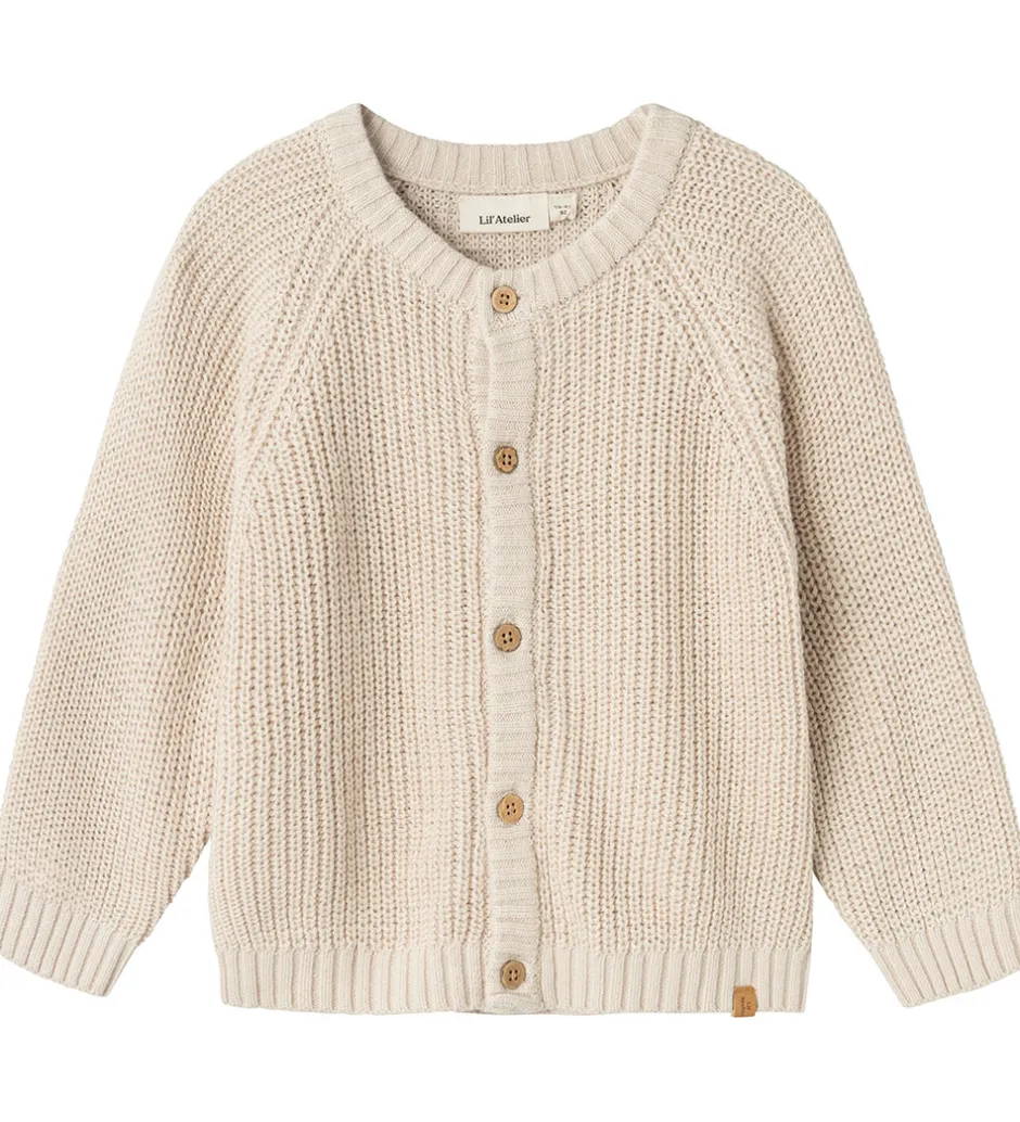 Flot Lil’ Atelier cardigan i ensfarvet beige strik med fin struktur.