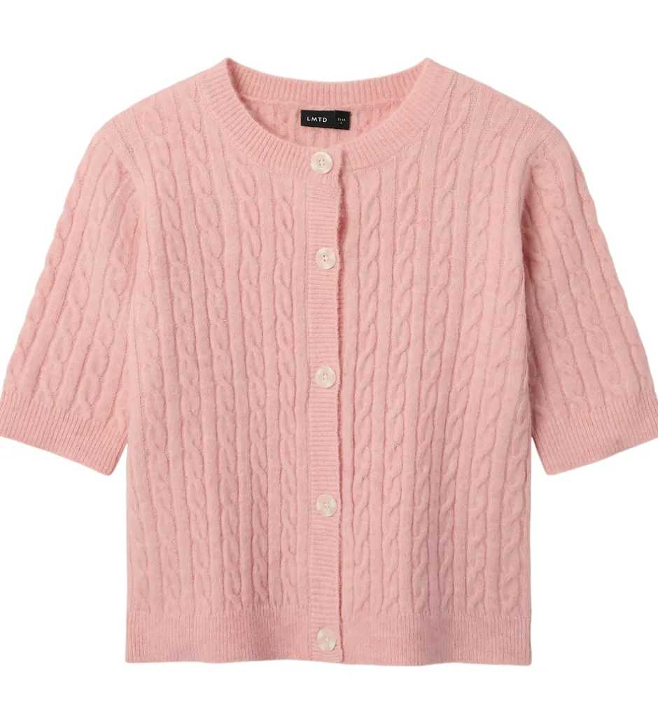 Charmerende LMTD cardigan i en blød lyserød nuance. Cardiganen præsenterer et klassisk flettet kabelmønster, der strækker sig over hele stykket. LMTD cardiganen har en kortærmet pasform og er udstyret med en rund halsudskæring. Den lukkes med fem diskrete knapper foran, hvilket giver den et harmonisk look. Ribkanter afslutter designet ved ærmerne samt forneden.