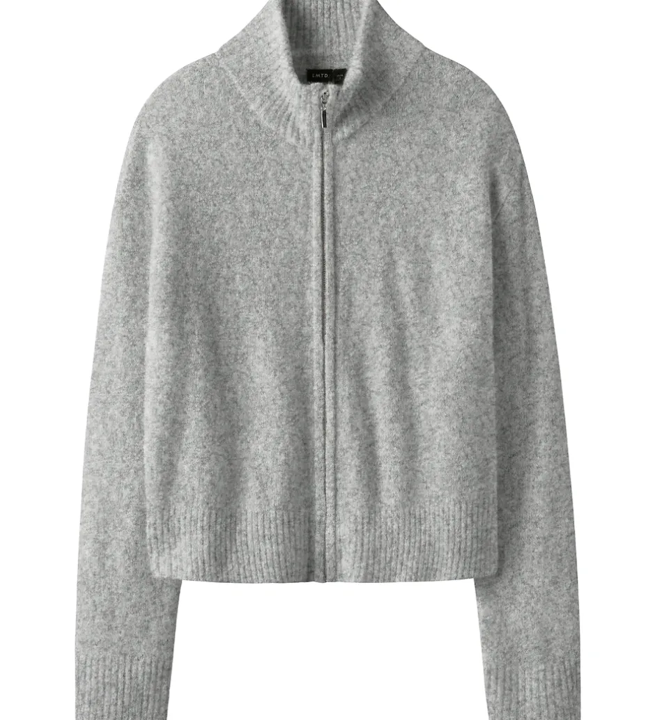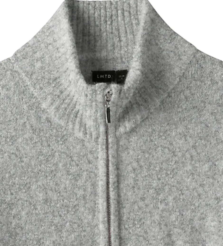 Flot LMTD cardigan i meleret lysegrå med strikket struktur. Cardiganen har en høj krave og gennemgående lynlås fortil. Den har brede ribkanter ved alle åbninger, som giver en god pasform.