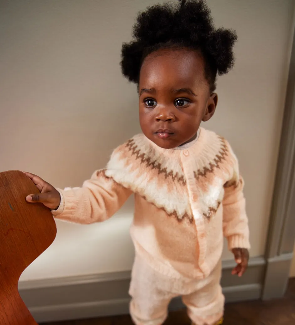 Yndig Molo cardigan i rosa strik, med et flot takket mønster i rosa, brune og grønne nuancer.