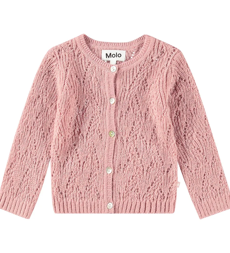 Fin Molo cardigan strikket med et flot hulmønster i ensfarvet rosa.