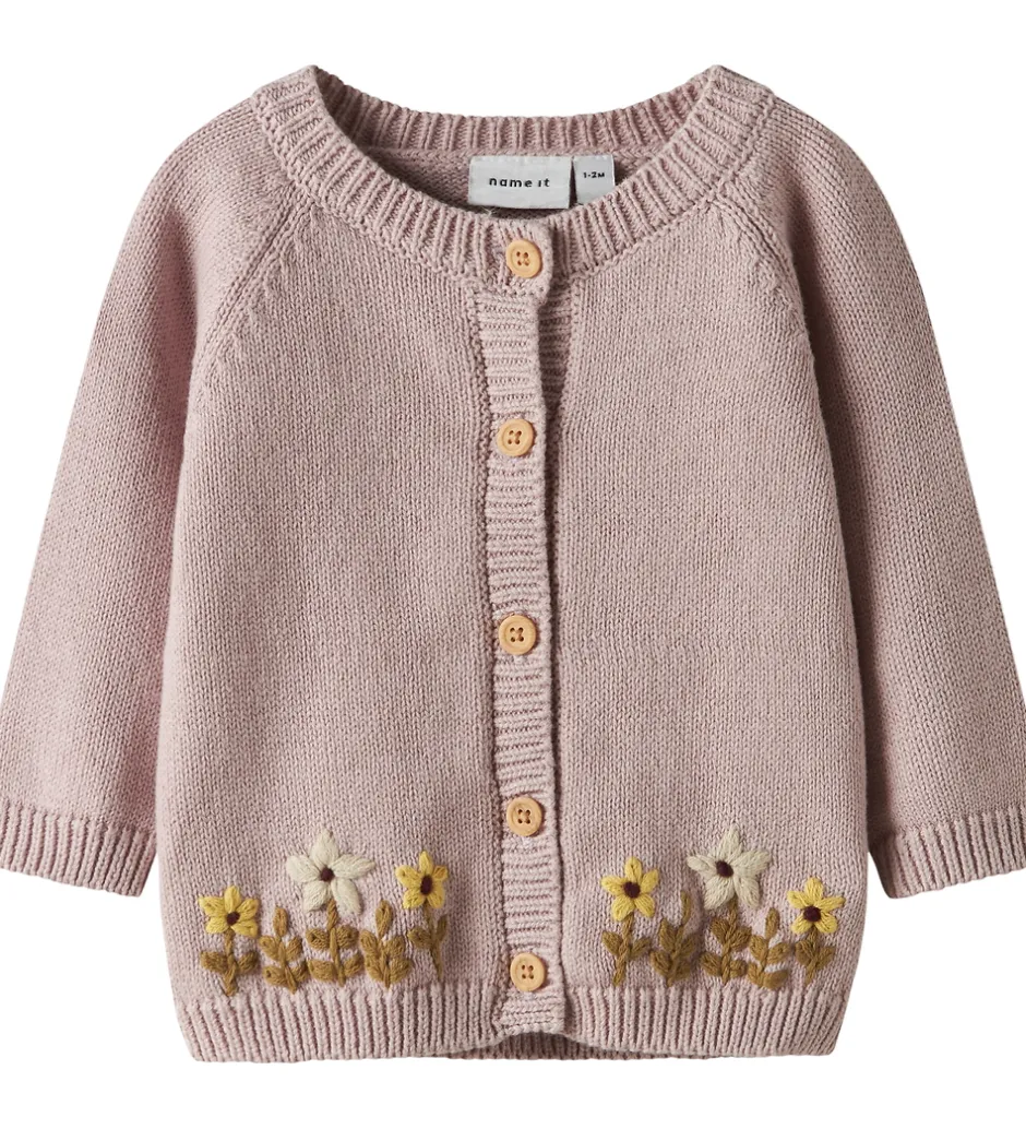 Charmerende Name It cardigan i en støvet rosa strik. Cardiganen er dekoreret med smukke broderede blomster i bunden, hvilket tilføjer et fint detaljeelement.