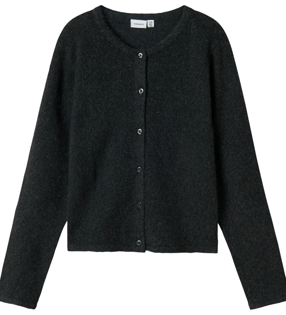 Stilren Name It cardigan i meleret koksgrå med fin, strikket struktur. Cardiganen har lange ærmer og en enkel knaplukning langs fronten. Den er lavet i et blødt materiale.