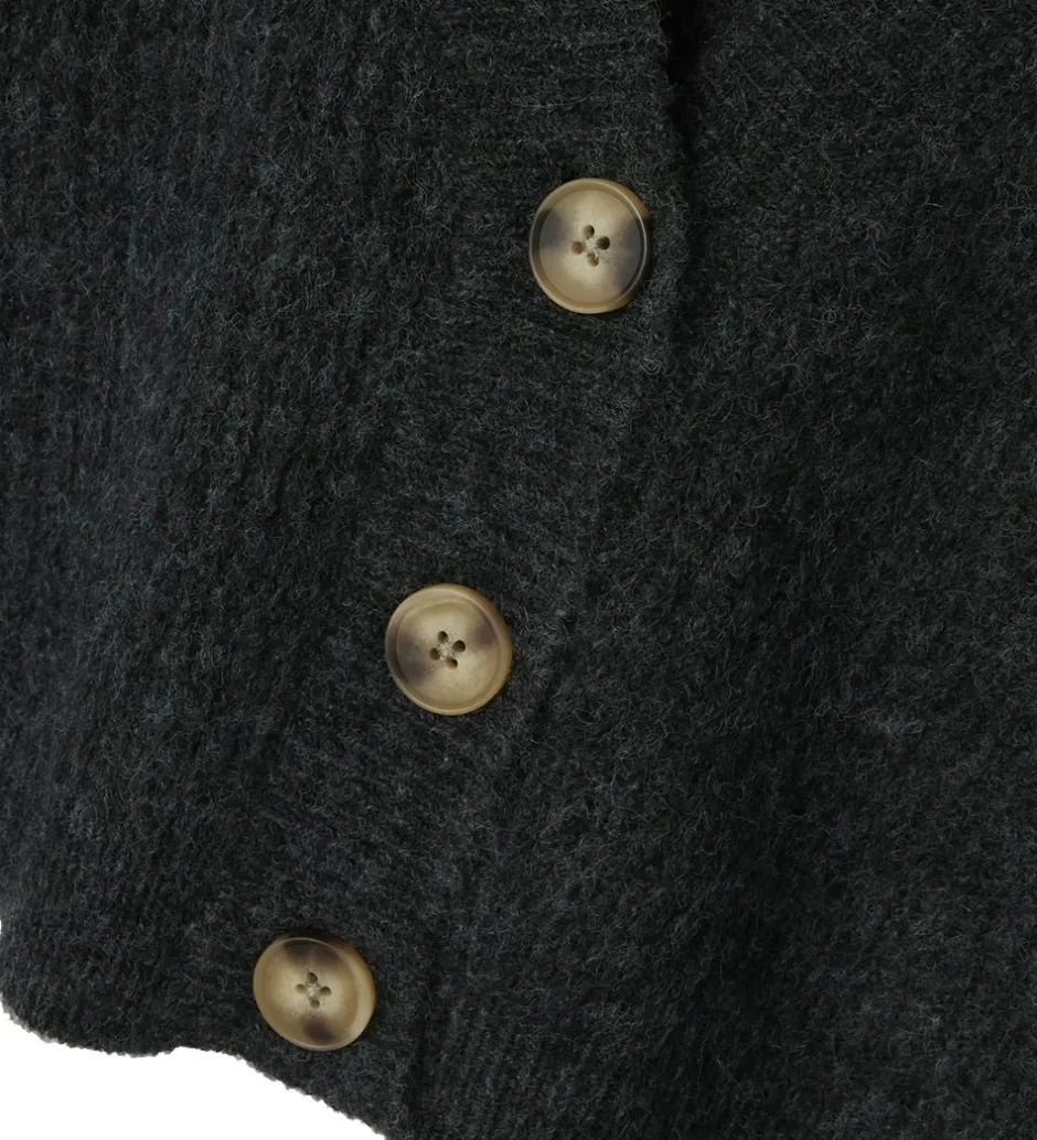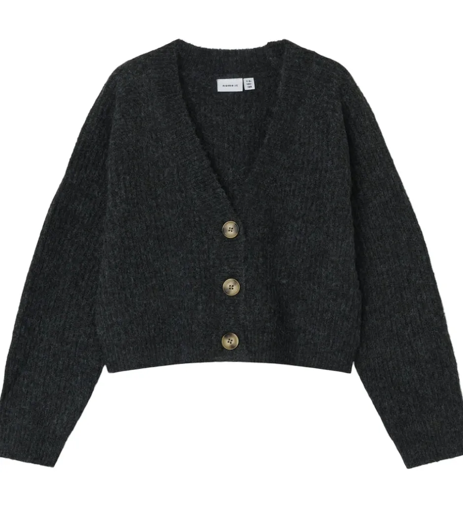 Skøn Name It cardigan i meleret, mørkegrå strik og med en flot ribstruktur.