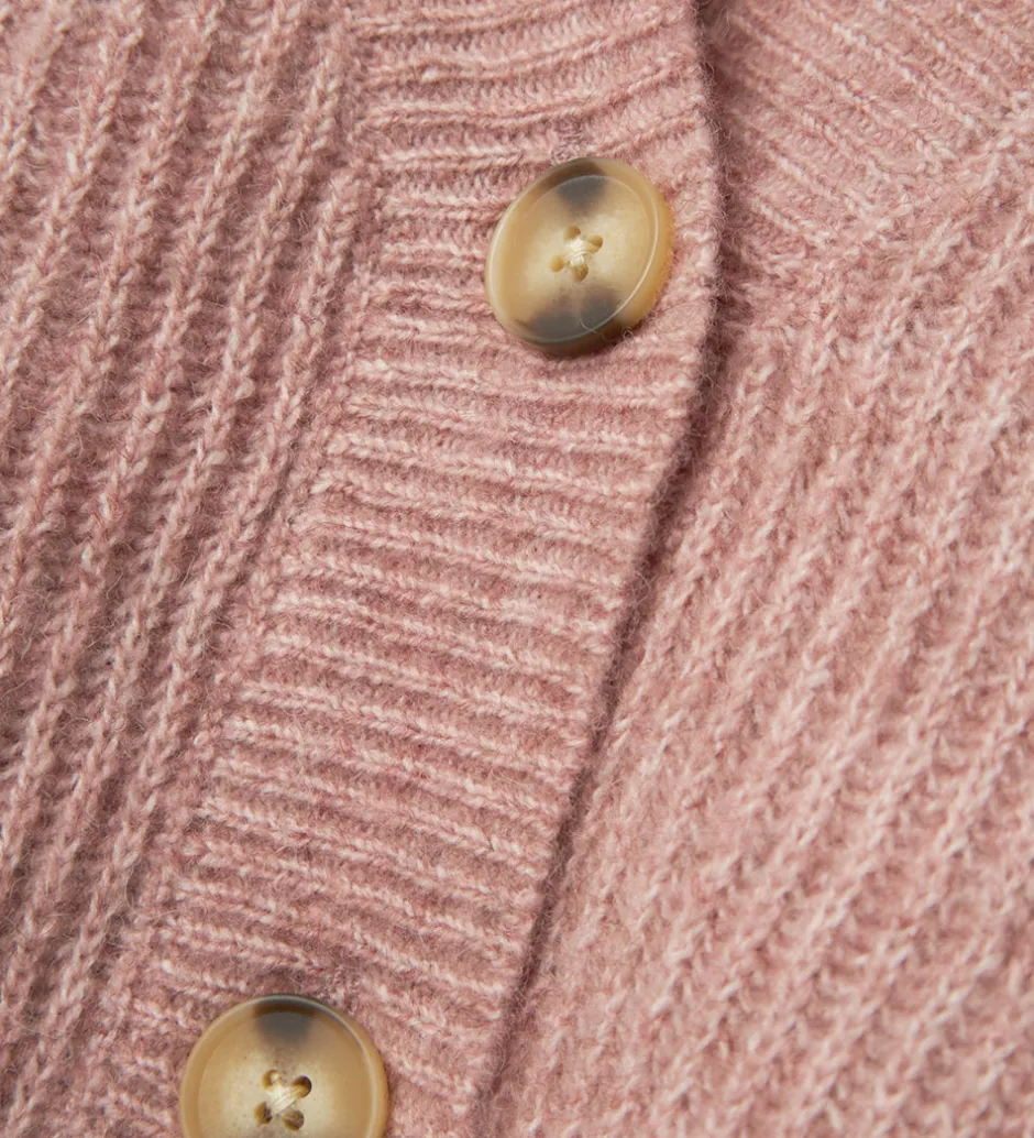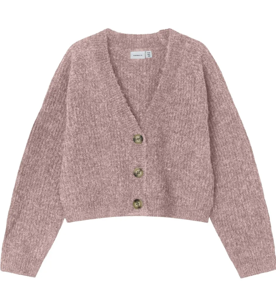 Skøn Name It cardigan i meleret, rosa strik og med en flot ribstruktur.