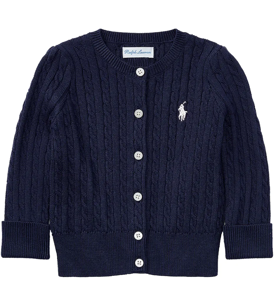 Polo Ralph Lauren cardiganen har lange ærmer og brede ribkanter, og den åbnes med små, hvide knapper.