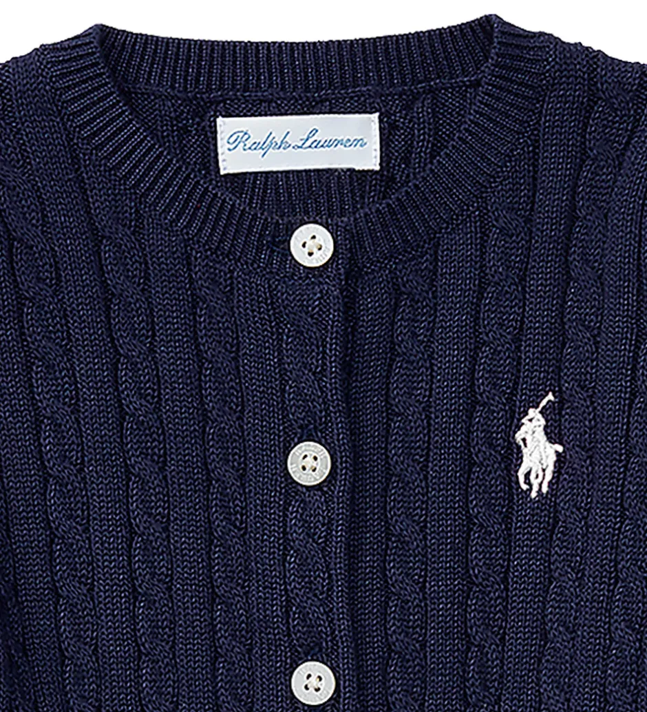 Flot Polo Ralph Lauren cardigan i navy i en strikket bomuldskvalitet med et flot, snoet mønster. Fortil i venstre side er der broderet et lille, hvidt logo.