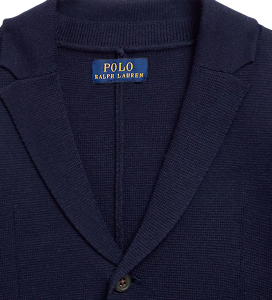 Polo Ralph Lauren cardiganen har et snit som en blazer med revers, og den lukkes med knapper. Fortil sidder der to lommer.