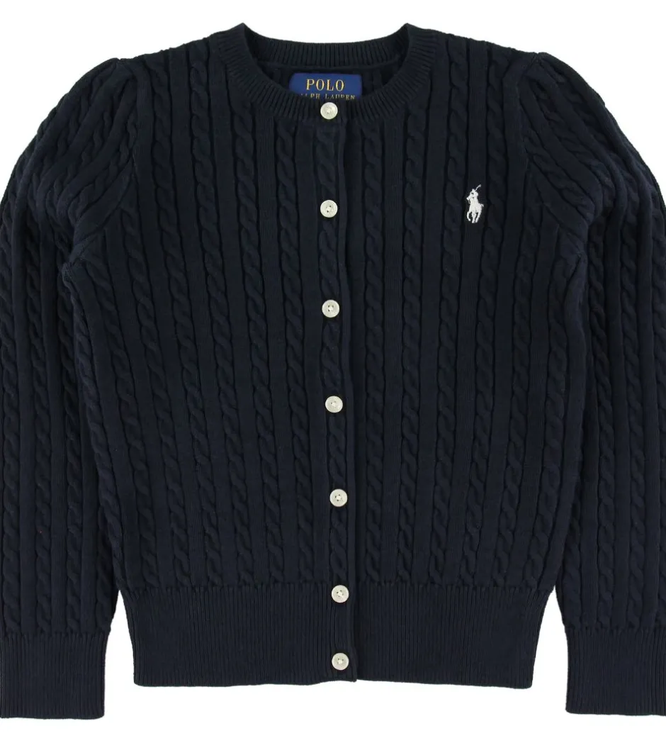 Sød Polo Ralph Lauren cardigan i en navy strikkvalitet, med et logo broderet i hvid i venstre side.