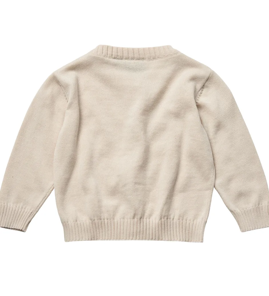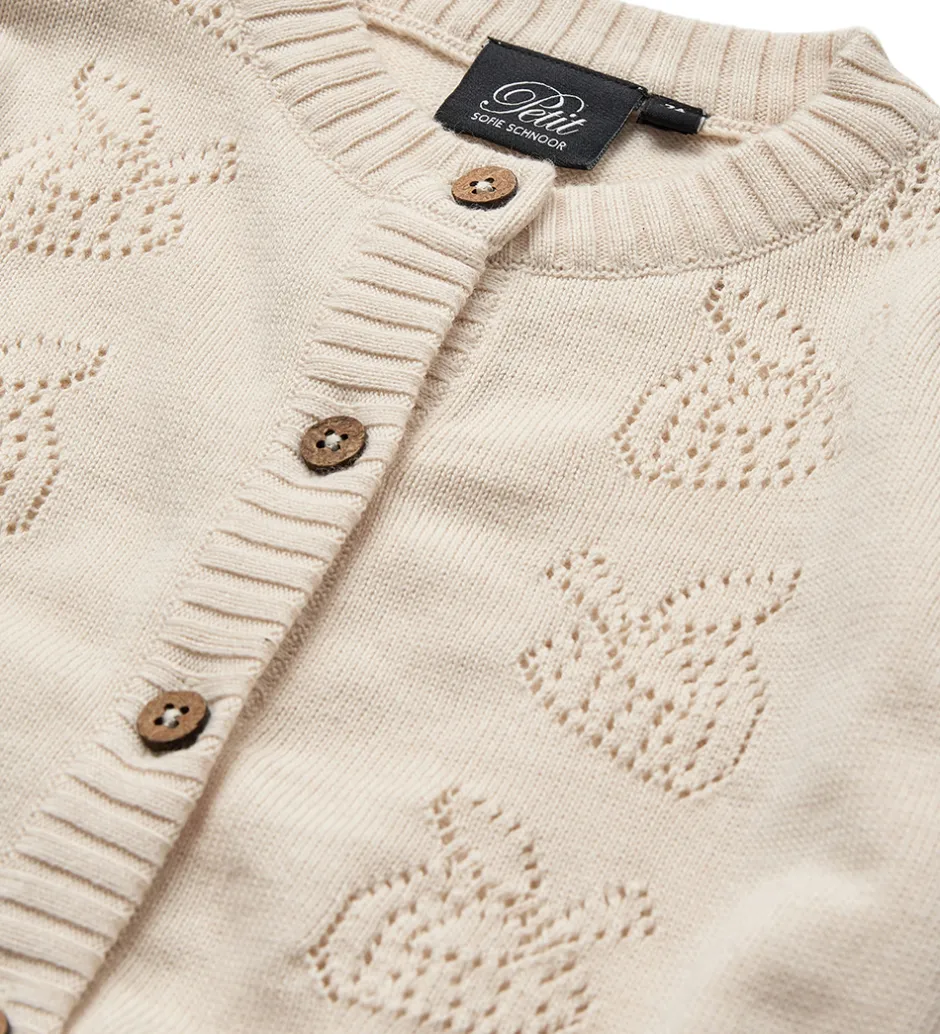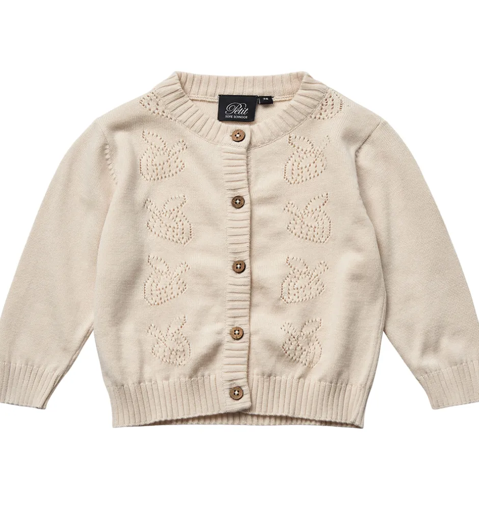 Flot Sofie Schnoor cardigan i råhvid strik, med et sødt hulmønster af jordbær fortil.