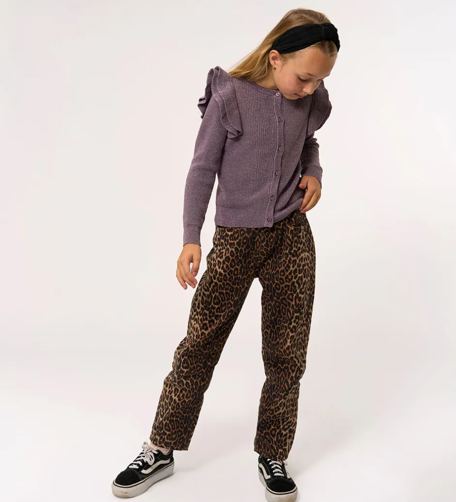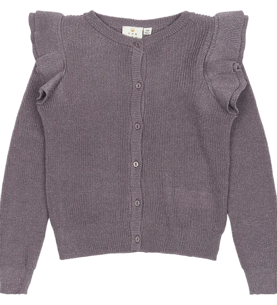 Sød cardigan fra The New i en smuk lilla ribstrik med sølvglimmer samt dekorative flæser over skuldrene. Cardiganen fra The New har en gennemgående knaplukning fortil med matchende glimmerknapper.