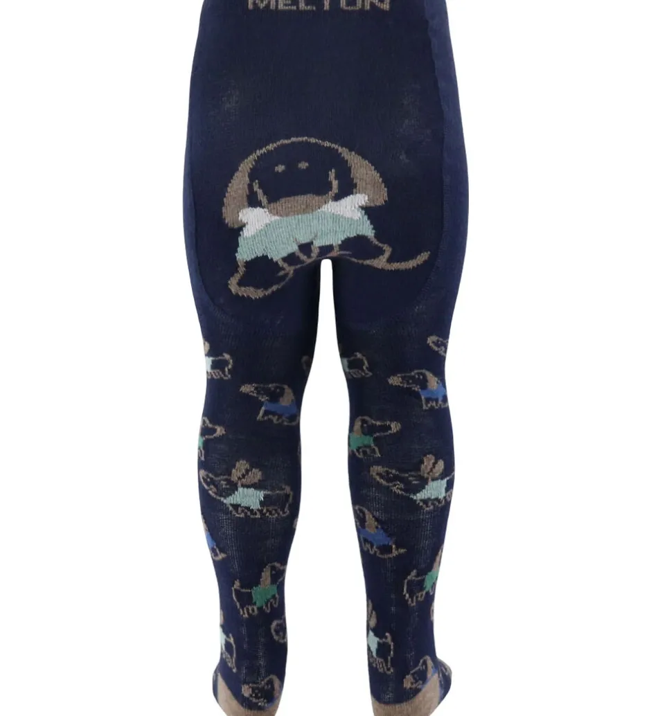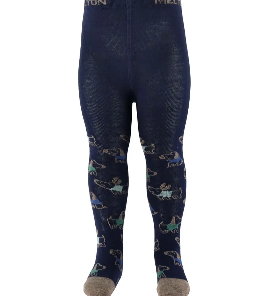 Skønne Melton strømpebukser i en mørk blå farve med et farverigt print af flyvende drager over hele produktet. De har en behagelig pasform og er et sjovt valg til enhver lille eventyrer.