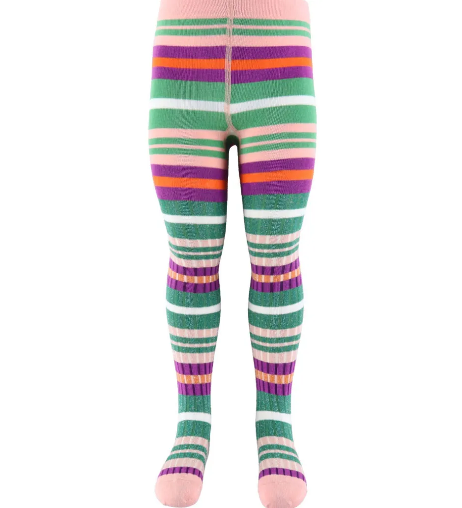 Farverige Molo strømpebukser med striber i grøn, pink, lilla og orange nuancer. Strømpebukserne har et lyst bånd foroven og et sjovt, skiftende mønster, der giver et livligt udtryk.