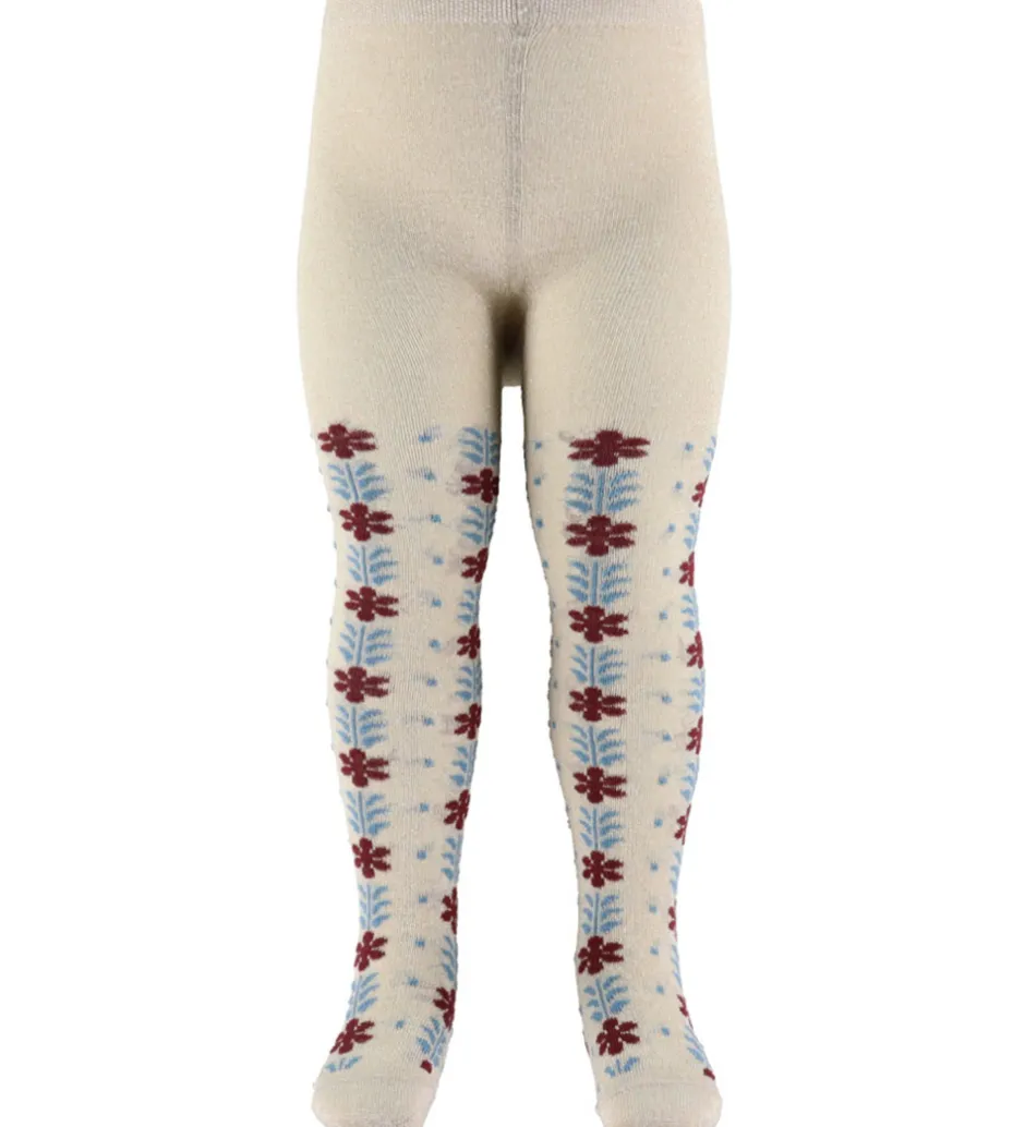 Charmerende MP strømpebukser i beige med glimmer og et mønster af røde blomster og blå blade. Strømpebukserne har en ribbet elastik i livet, hvilket sikrer en god pasform. Det bløde materiale og det flotte mønster gør MP strømpebukser til et behageligt valg.