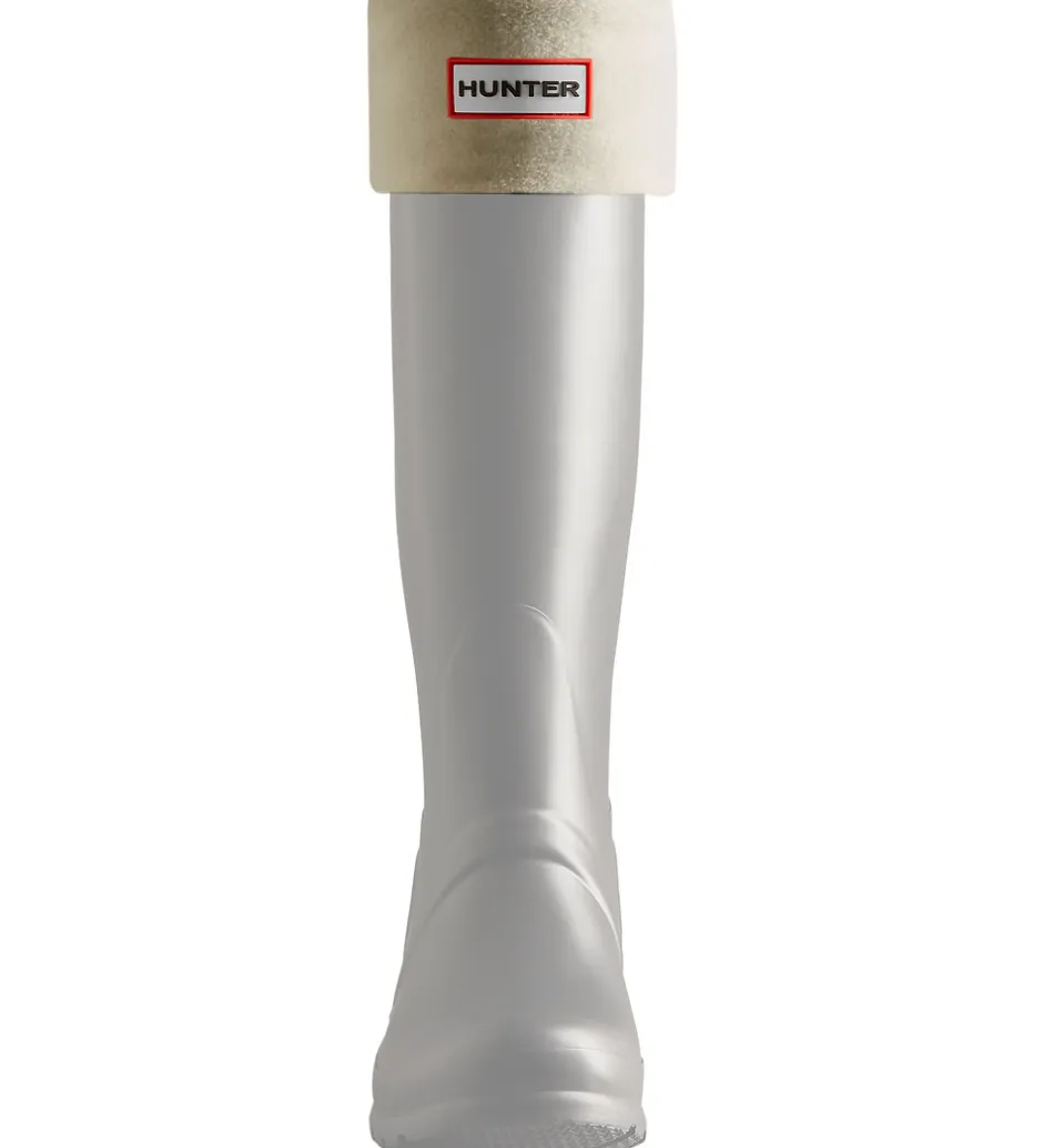 Fine Hunter støvlestrømper i hvidt fleece med et langt skaft og et logo øverst. Hunter støvlestrømperne passer i Hunter gummistøvler med et langt skaft, og kan bukkes rundt om skaftet i toppen. Det bløde fleece hjælper med at holde fødderne varme i de kolde måneder, og kan let fjernes igen, når temperaturen stiger.