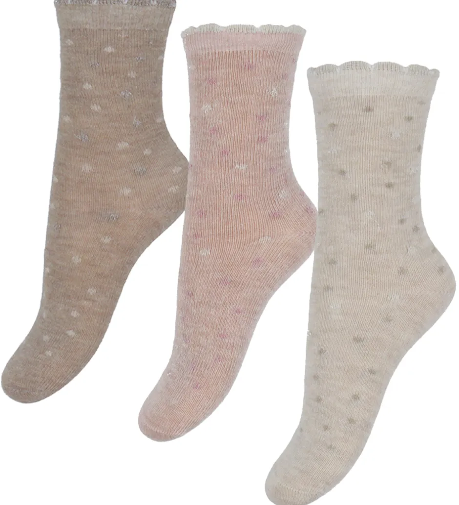 Behagelige Minymo strømper solgt i en 3-pak i brun, rosa og beige med prikker og glimmer. Minymo strømperne har en bølget kant øverst på skaftet. Strømperne har en blød struktur, der sikrer en god pasform.