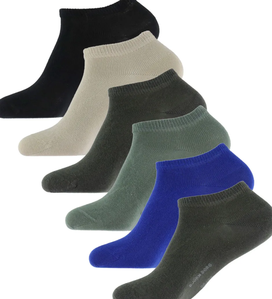 Praktiske Björn Borg ankelstrømper solgt i en 7-pak med farverne sort, beige, mørkegrøn, grøn og blå. Björn Borg ankelstrømperne har en smal elastikkant øverst, der sikrer en god pasform. Hver strømpe er designet med enkel ensfarvet stil og kort skaft.