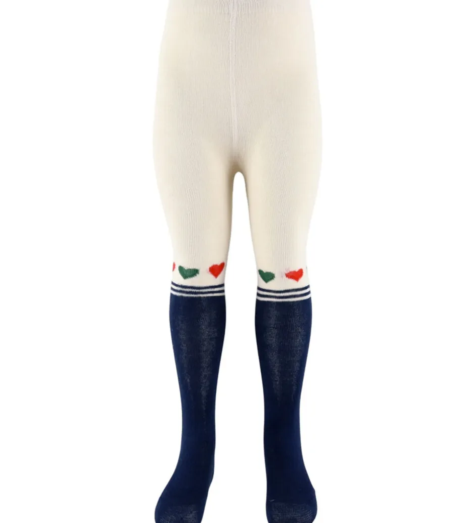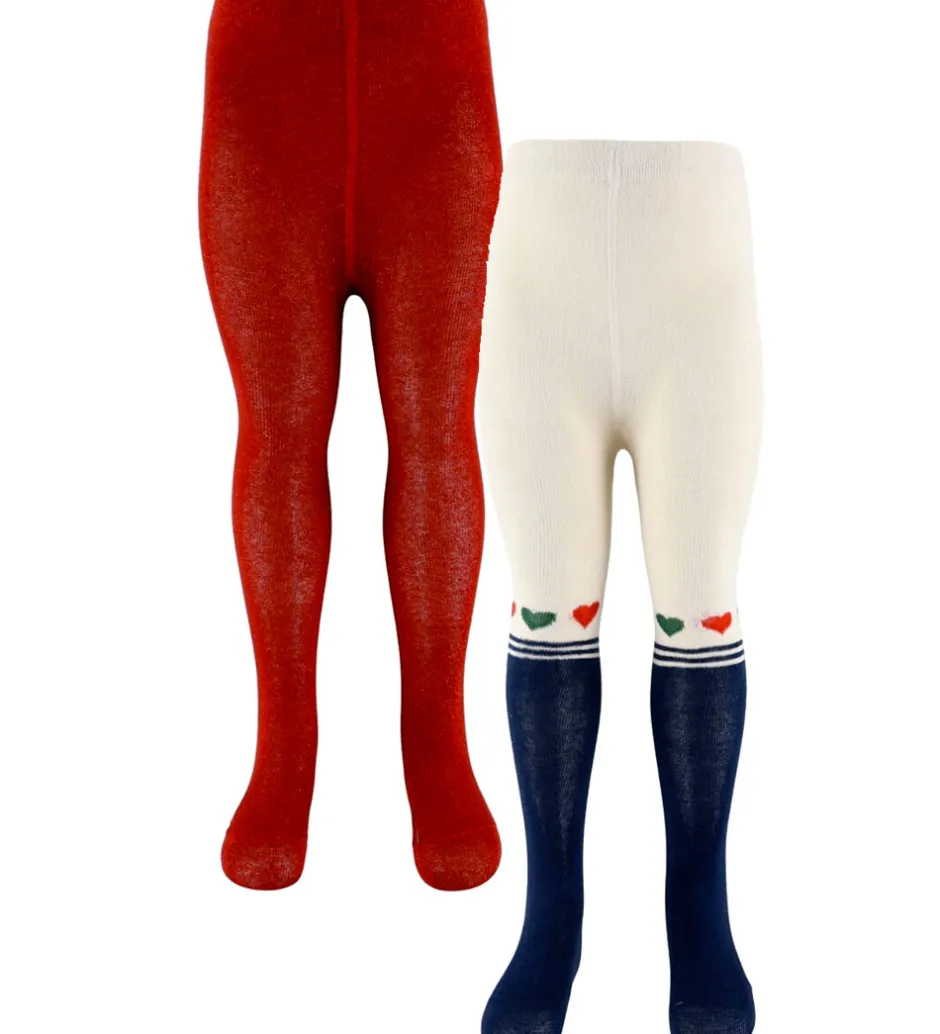Praktiske Konges Sløjd strømpebukser solgt i en 2-pak. Den ene er i ensfarvet rød, mens den anden er hvid med blå ben og små, farvede hjerter samt dobbelte striber omkring anklerne. Begge par har en elastisk talje for en behagelig pasform.