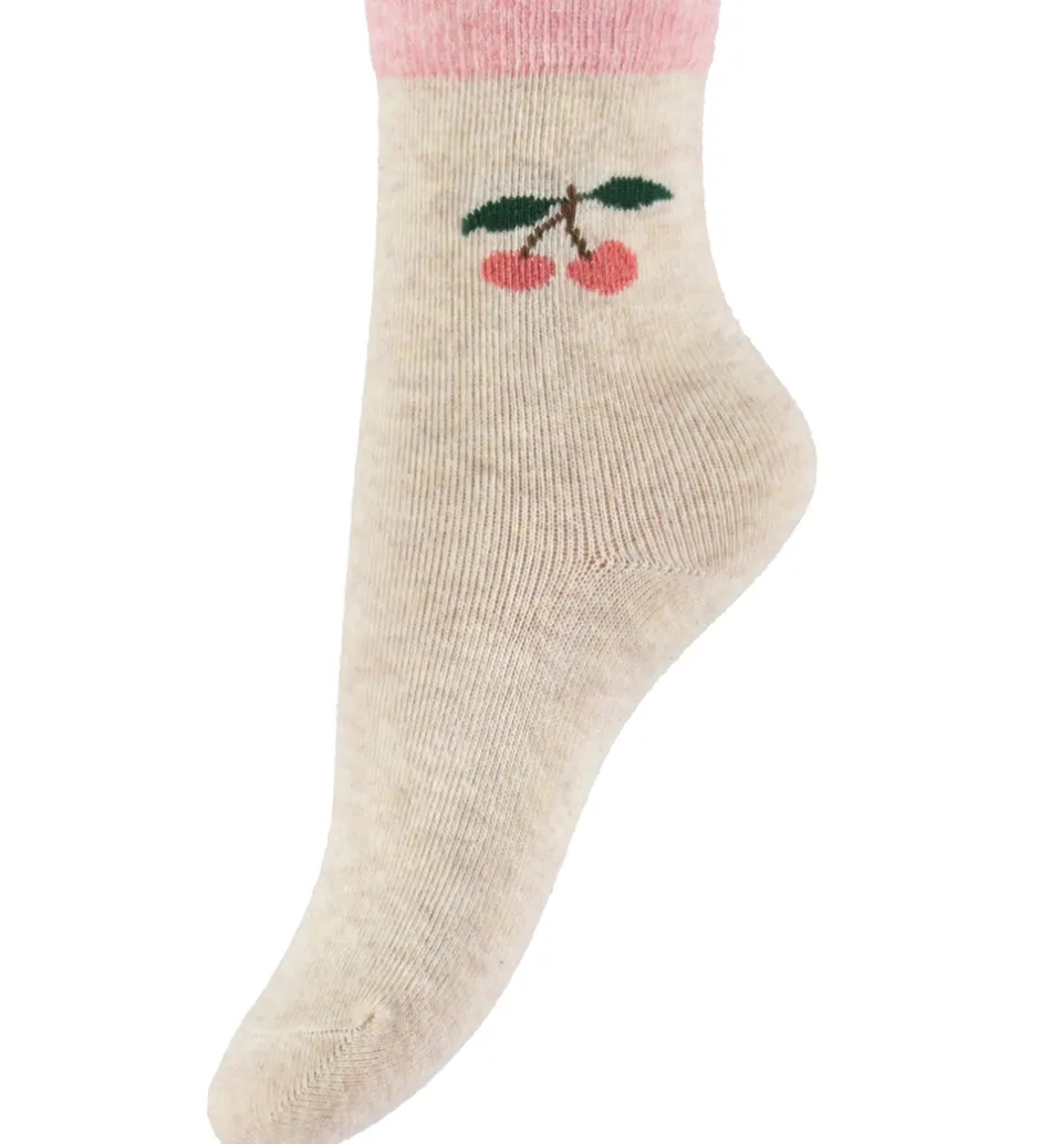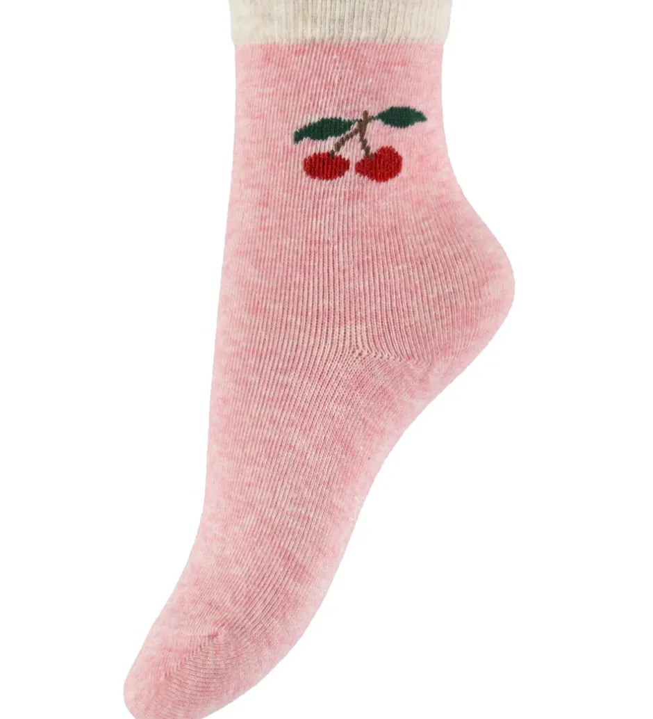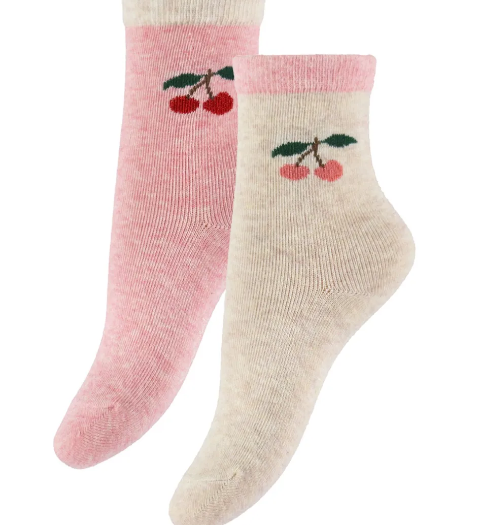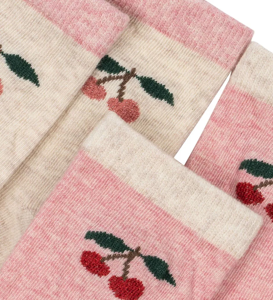Charmerende Konges Sløjd strømper solgt i en 2-pak i meleret rosa og meleret lysebeige. Begge par prydes af et fint kirsebærmotiv på skaftet. Strømperne har en smal ribkant øverst, der sikrer god pasform.