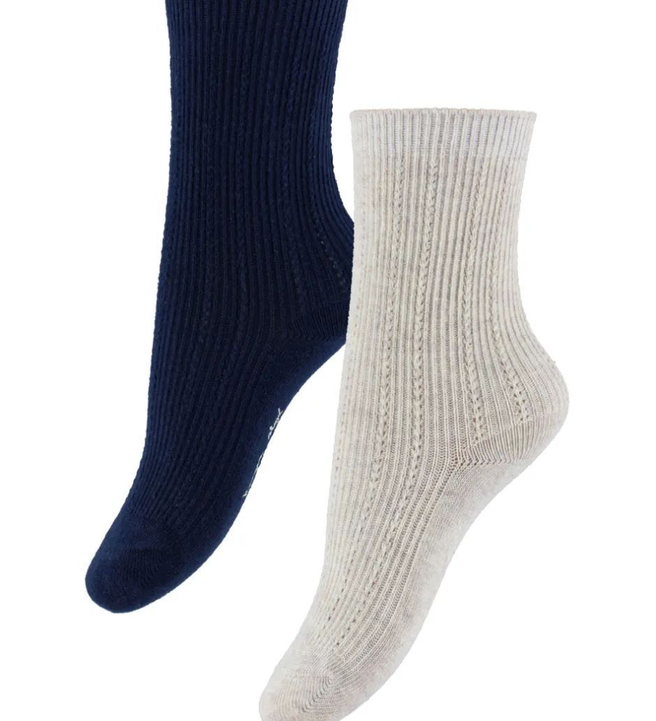 Stilfulde Konges Sløjd strømper i en 2-pak i farverne mørkeblå og beige. Strømperne er konstrueret i en klassisk ribstruktur, hvilket giver dem en elastisk pasform og en god holdbarhed. Toppen er udstyret med en smal ribkant, der sikrer, at strømperne sidder godt fast på benene.