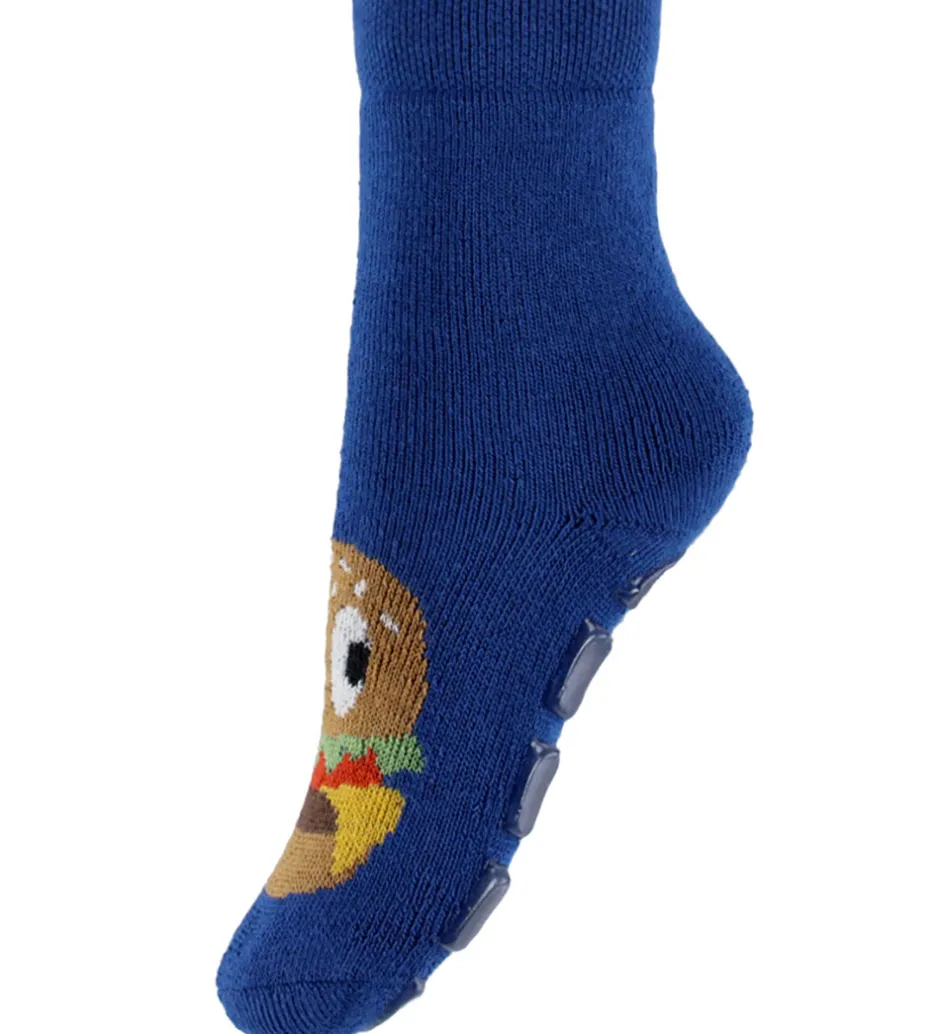 Sjoe Melton strømper i blå, og på foden er der et print med en burger.