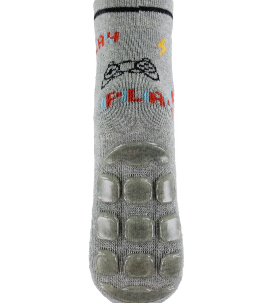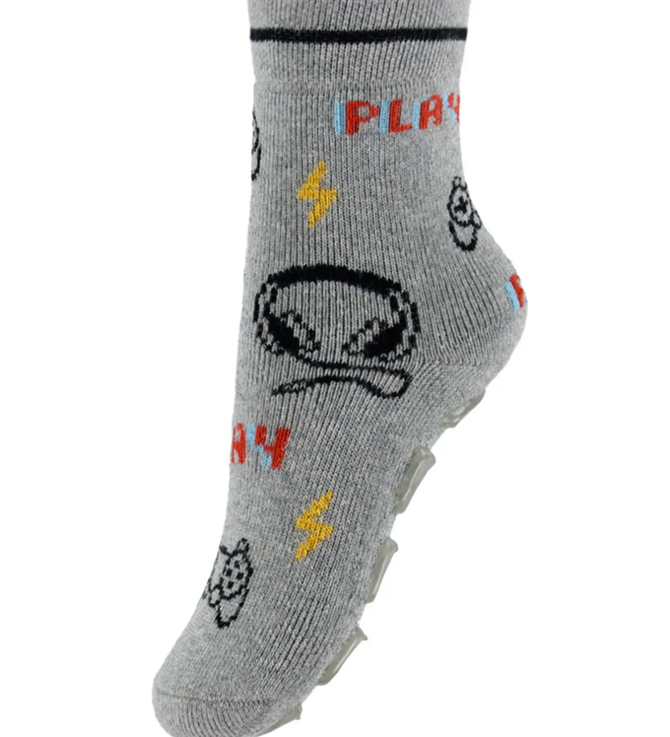 Seje Melton strømper i meleret lysegrå med et print med sorte controllere og høretelefoner samt gule lyn og ordet “Play” i rød og lyseblå.